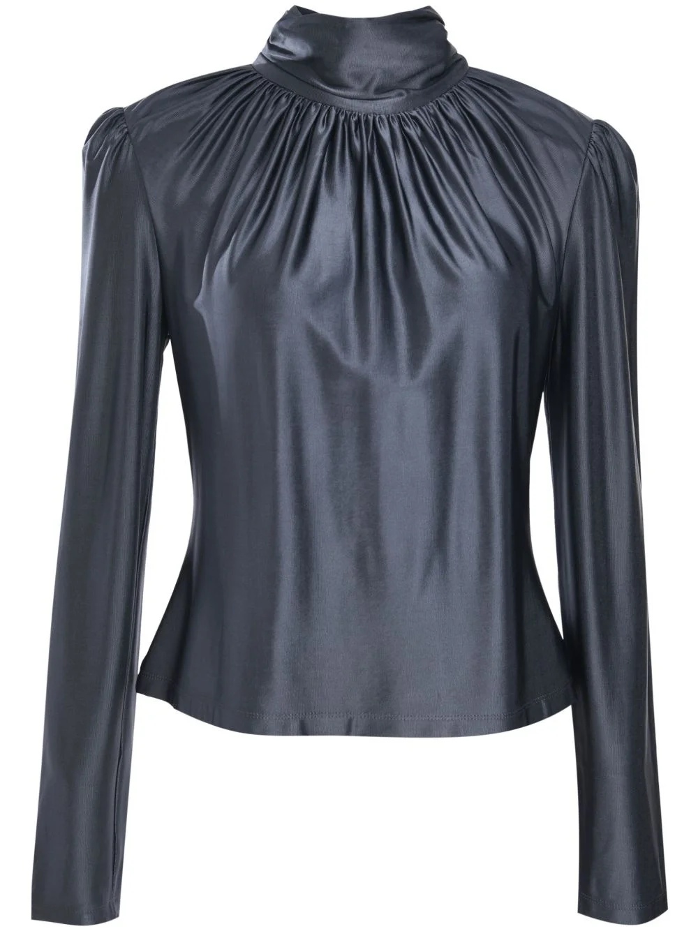 high-neck top Highlights - Dark grey - Stretch-design - Jersey texture - Gathered detailing - High neck - Rear buckle fastening - Long sleeves Imported Composition Viscose 90%, Elastane 10% Washing instructions Read Manufacturer Guidelines