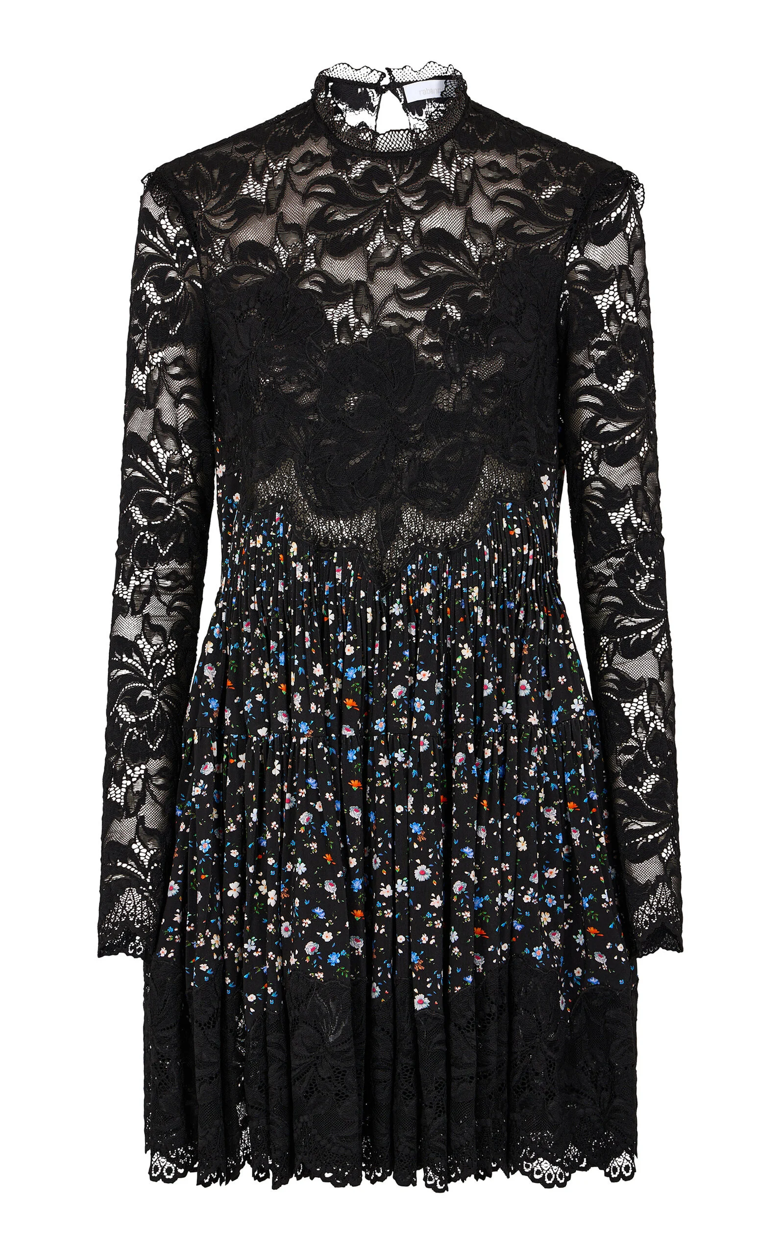 PRODUCT DETAILS - High neck, lace paneling, flowy fit, mini hem - Button fastening - Unlined - Composition: 90% Polyamide, 10% Elastane; 2nd Fabric: 90% Viscose, 10% Elastane - Color: Black - Dry clean only - Pre-Fall '25