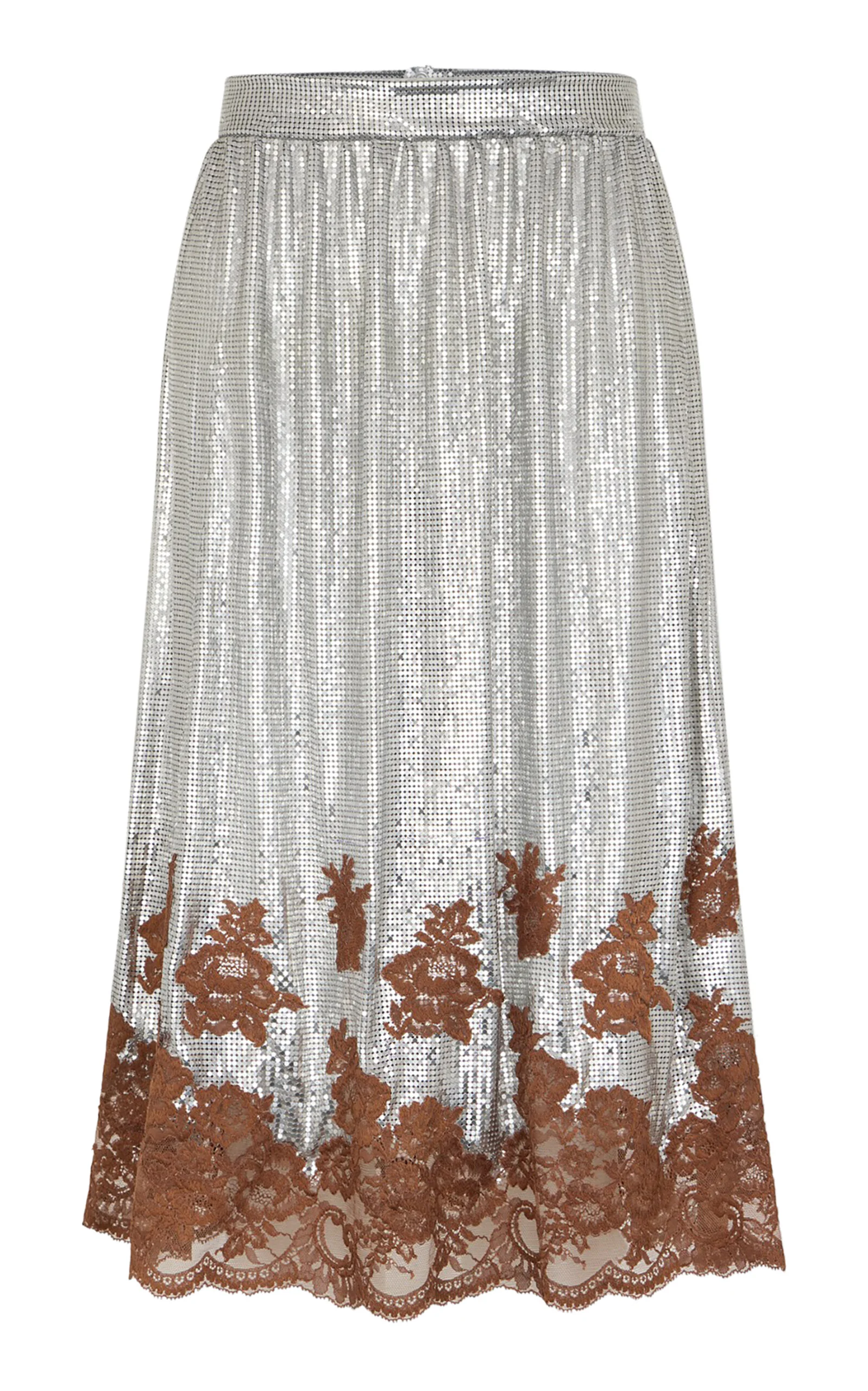 Each season, Julien Dossena builds off the last, championing Rabanne’s house codes and vintage-inspired luxuries while encapsulating our impulse to let go of tradition and try something new. Taking on a classic silhouette, this pleated skirt sits high on the waist and falls just below the knee. It’s made from silver-tone aluminium, delicately edged with lace at the hem. Contrast the metallic sheen with robust knitwear. PRODUCT DETAILS - Fall/Winter ‘25 - Zip fastening - Composition: 100% aluminum; Trim: 52.8% nylon, 47.1% polyester, 0.1% elastane - Dry clean - Imported