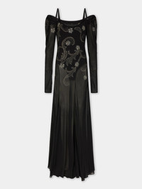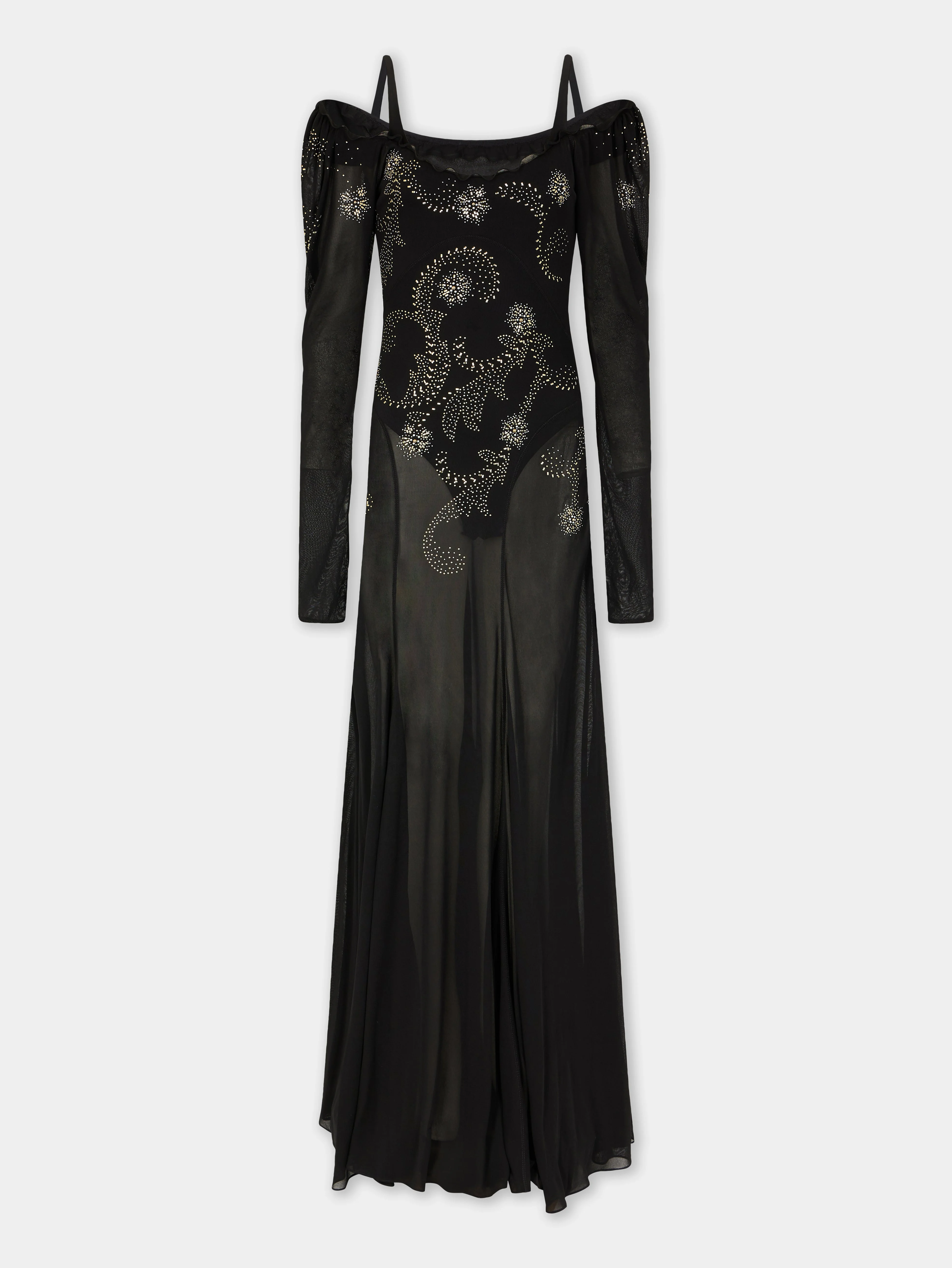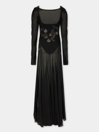 Evening long dress with bodice, boat neck and long sleeves in see-through jersey featuring floral embroidery details. - Color: Black - Long sleeves - Floor-length - The model is fully embroidered with silver and gold hotfix, forming a floral pattern. Integrated body in opaque jersey. - Composition: 100% Viscose - Made in Portugal Size & Fit - Model's height: 180 cm / 5ft 11in - Model wears a size FR 36 / UK 8 / US 4 - This style is true-to-size - We recommend your usual size.