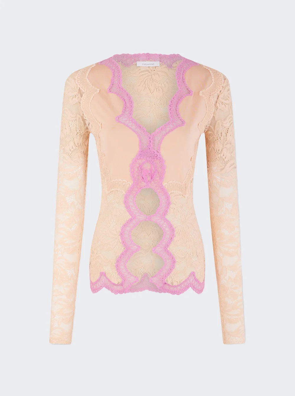 Details - Slim fit - Long sleeves - V-neckline - Lace construction - Scalloped trims - Satin panels - Care according to label - Material: 90% Polyamide, 10% Elastane Vendor Color Code: Brand Style: 26PJTO173PA0170 Designer/Brand: RABANNE