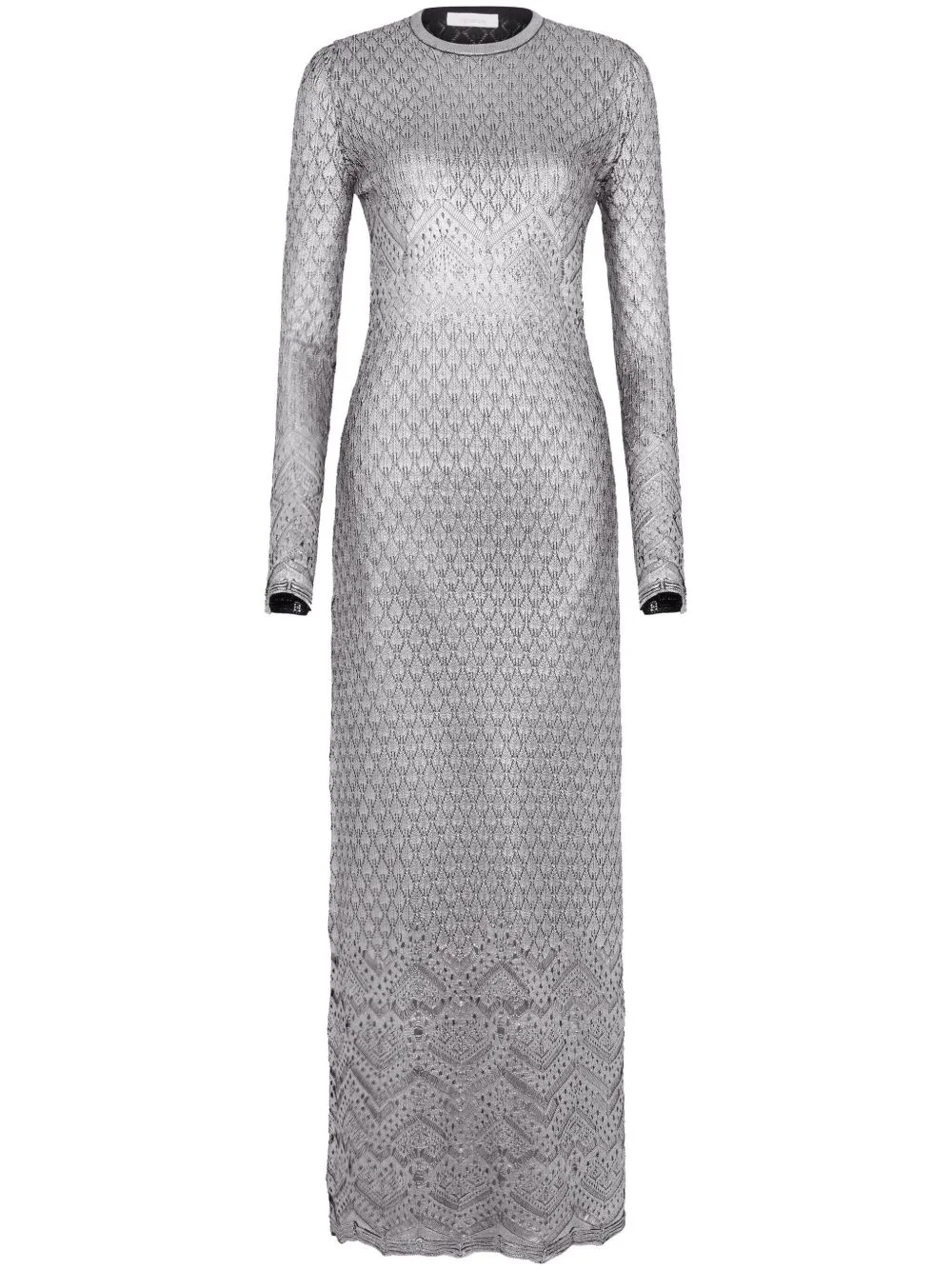 metallic knitted maxi dress Highlights - Silver-tone - Knitted construction - Crochet knit - Metallic effect - Long sleeves - Scallop hem - Pull-on style Imported Composition Viscose 100% SIZE & FIT Measurement SLEEVE LENGTH 24.8 in(63 cm) HIPS 35.43 in(90 cm) LENGTH 52.75 in(134 cm) WAIST 27.95 in(71 cm) Washing instructions Read Manufacturer Guidelines