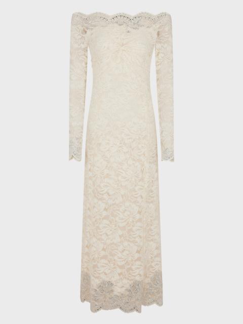 Midi dress with long sleeves in lace adorned with silver studs. - Color: Ivory - Stretch fabric - Boat neck - Long sleeves - Ankle-length - Composition: 90% polyamide, 10% elastane - Made in Tunisia Size & Fit - Model's height: 180 cm / 5ft 11in - Model wears a size FR 36 / UK 8 / US 4 - This style is true-to-size - We recommend your usual size.