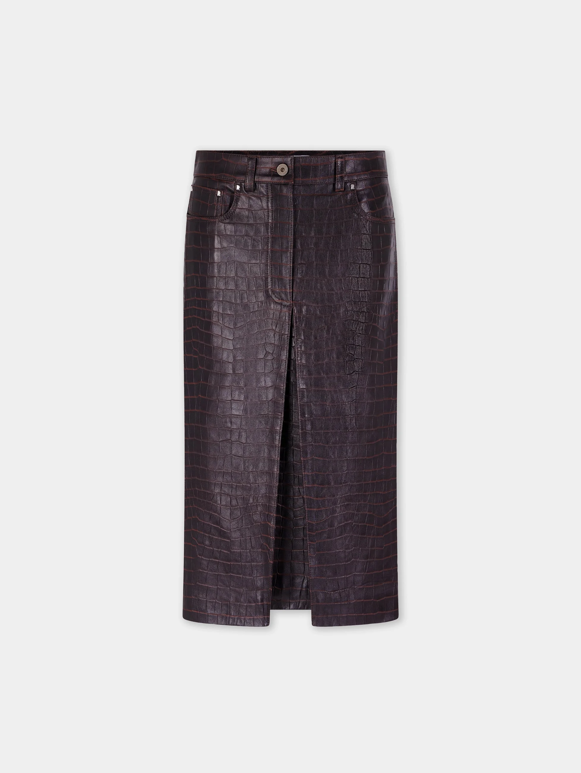 Crocodile-effect mid-length leather skirt. - Color: Dark brown - Midi skirt - 100% Cowhide - Made in Turquie Size & Fit - Model's height: 180 cm / 5ft 11in - Model wears a size FR 36 / UK 8 / US 4 - This style is true-to-size - We recommend your usual size.