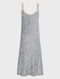 Midi sequin dress with thin straps embellished with silver pearls. - Color: Silver - Rounded neckline - Sleeveless - Knee-length - Composition: 100% polyester - Made in Madagascar Size & Fit - Model's height: 180 cm / 5ft 11in - Model wears a size FR 36 / UK 8 / US 4 - This style is true-to-size - We recommend your usual size.