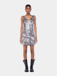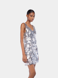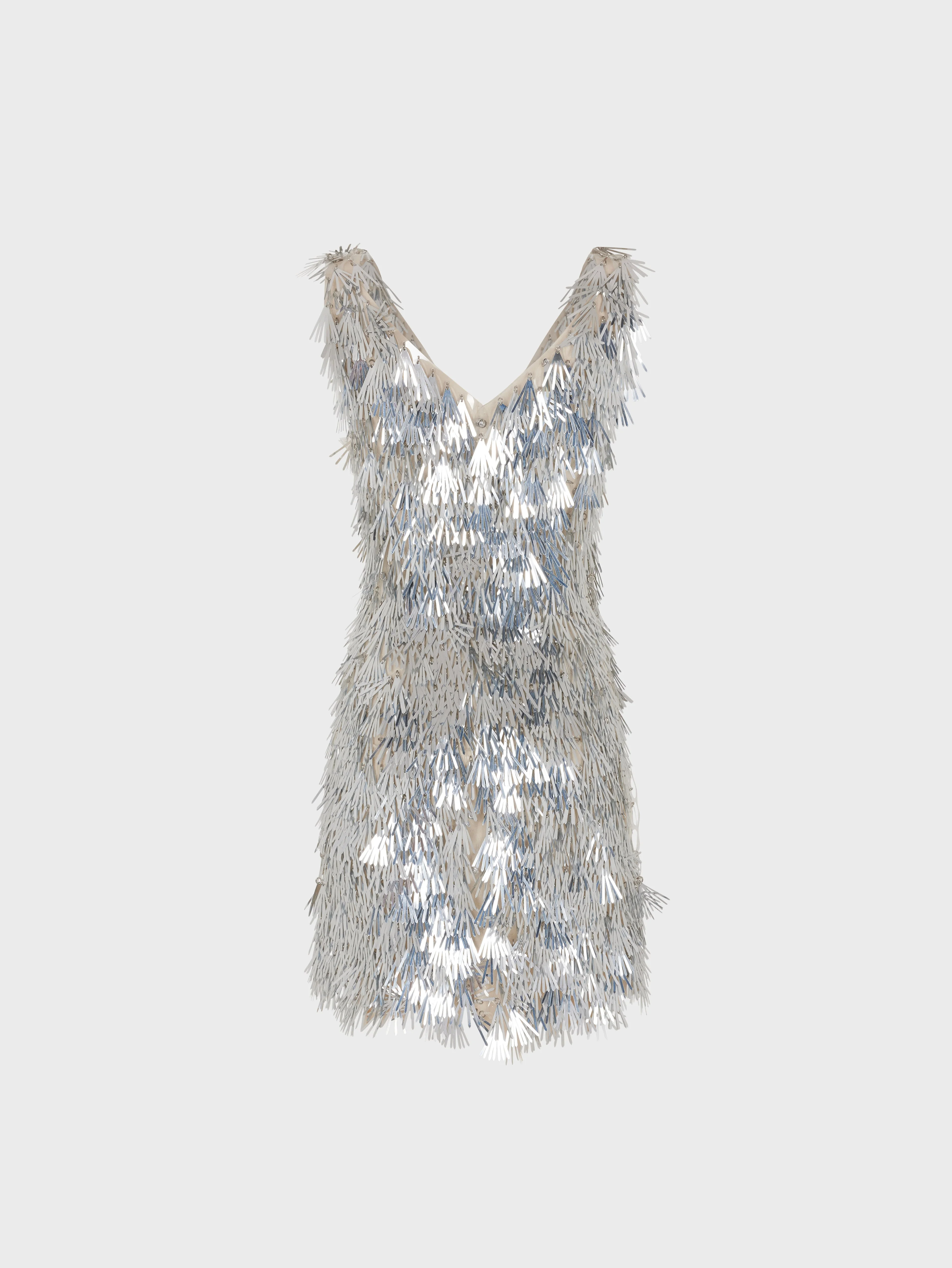Straps mini dress with V neck in an assembly inspired by metallic fur, featured in the show FW25. - Color: Silver - V-neckline - Sleeveless - Mini length - Composition: 100% Polyurethane - Made in Madagascar Size & Fit - Model's height: 180 cm / 5ft 11in - Model wears a size FR 36 / UK 8 / US 4 - This style is true-to-size - We recommend your usual size.
