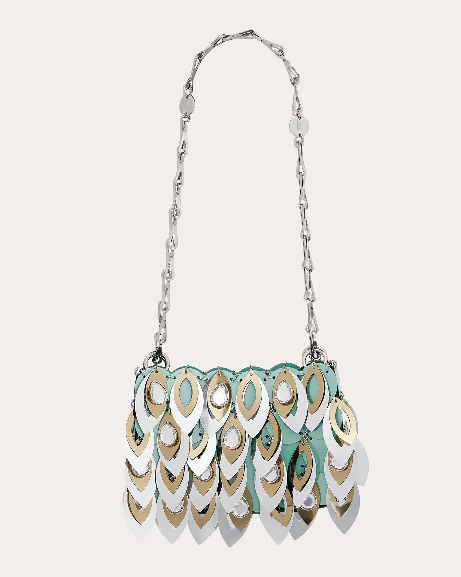 A nod to Rabanne's iconic, inaugural aesthetic, this pliable mini bag is formed from multicolored layers of circular and teardrop-shaped discs. Glass crystal embellishments create light-reflecting shimmer. Designer color name: Green / SIlver Magnetic closure Chain link straps Engraved monogram medallions (straps) Layered teardrop paillettes Glass crystal embellishments Self: 70% polyester, 10% steel, 10% brass, 10% glass Lining: 100% nylon Spot clean Made in Madagascar Measurements Width: 6.3in Height: 4.33in Depth: 1.57in