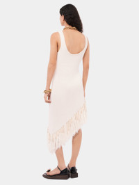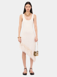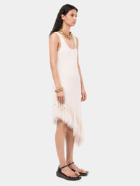 ASYMMETRICAL OFF WHITE WOVEN DRESS WITH KNITTED BEADS AND FEATHERS