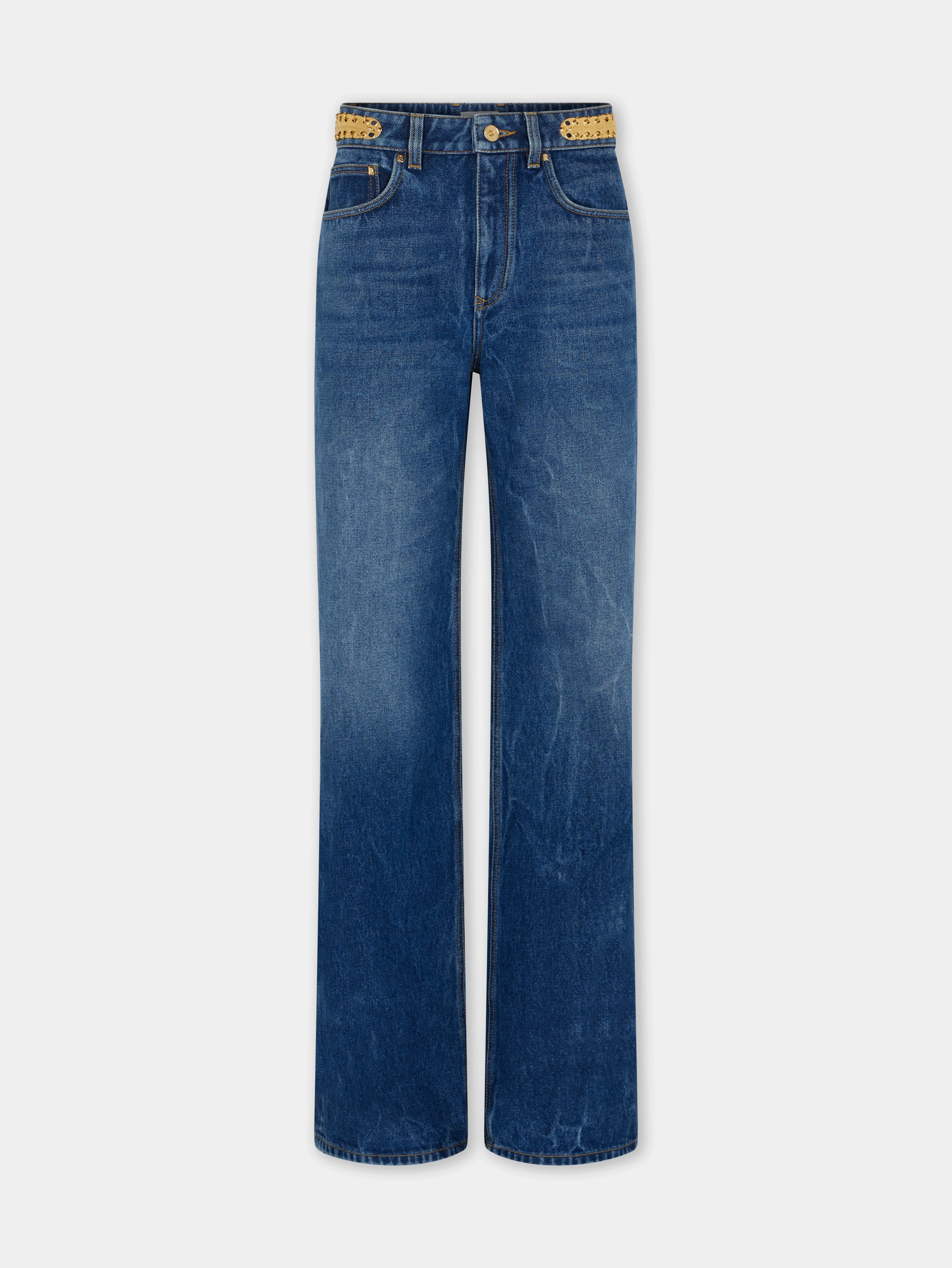 Baggy jeans in dark washed blue denim featuring gold medals at the belt. - Color : Dark denim stone - Classic length - Embellished with 1969 medals at the belt - Gold signature rivets - Composition : 100% Cotton - Made in Italy Size & Fit - Model's height: 177 cm / 5ft 9,5in - Model wears a size FR 26 / UK 8 / US 4 - This style runs large - If you are between two sizes, choose the size below. Otherwise, choose your usual size.