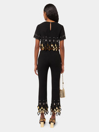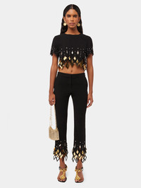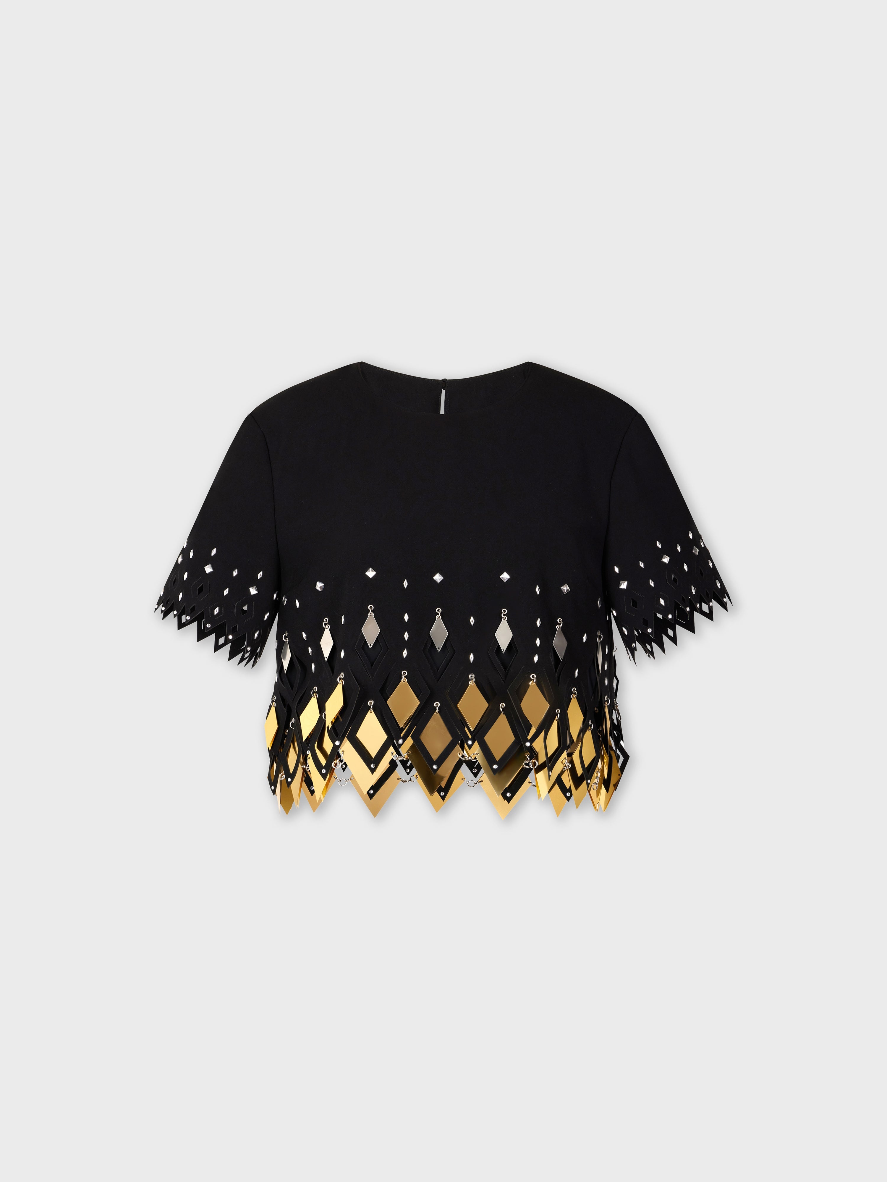 Short-sleeved crop top black. Iconic assembly of the Rabanne Maison made with a diamond-shaped laser giving a luxurious and unexpected touch. Our Fall-Winter 2017 collection iconic piece revisited for you. DETAILS - 100% Polyester - Theme inspired by the FW17 collection - Laser cutting, Hand assembly - Model's height: 179 cm / 5ft 10,5in. - Model wears a size FR 36 / UK 8 / US 4