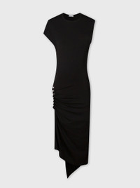 Made from jersey, this black drape dress has a slim fit and pleat along one side due to its silver-toned snap fastenings. The elegant black jersey dress has asymmetrical sleeves and hemline and is a timeless classic from the House of Rabanne. DETAILS - Main materials: 98% viscose, 2% elastane - Care instructions: Machine wash at 30 ° - The model measures 171cm and wears size 36