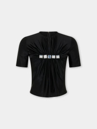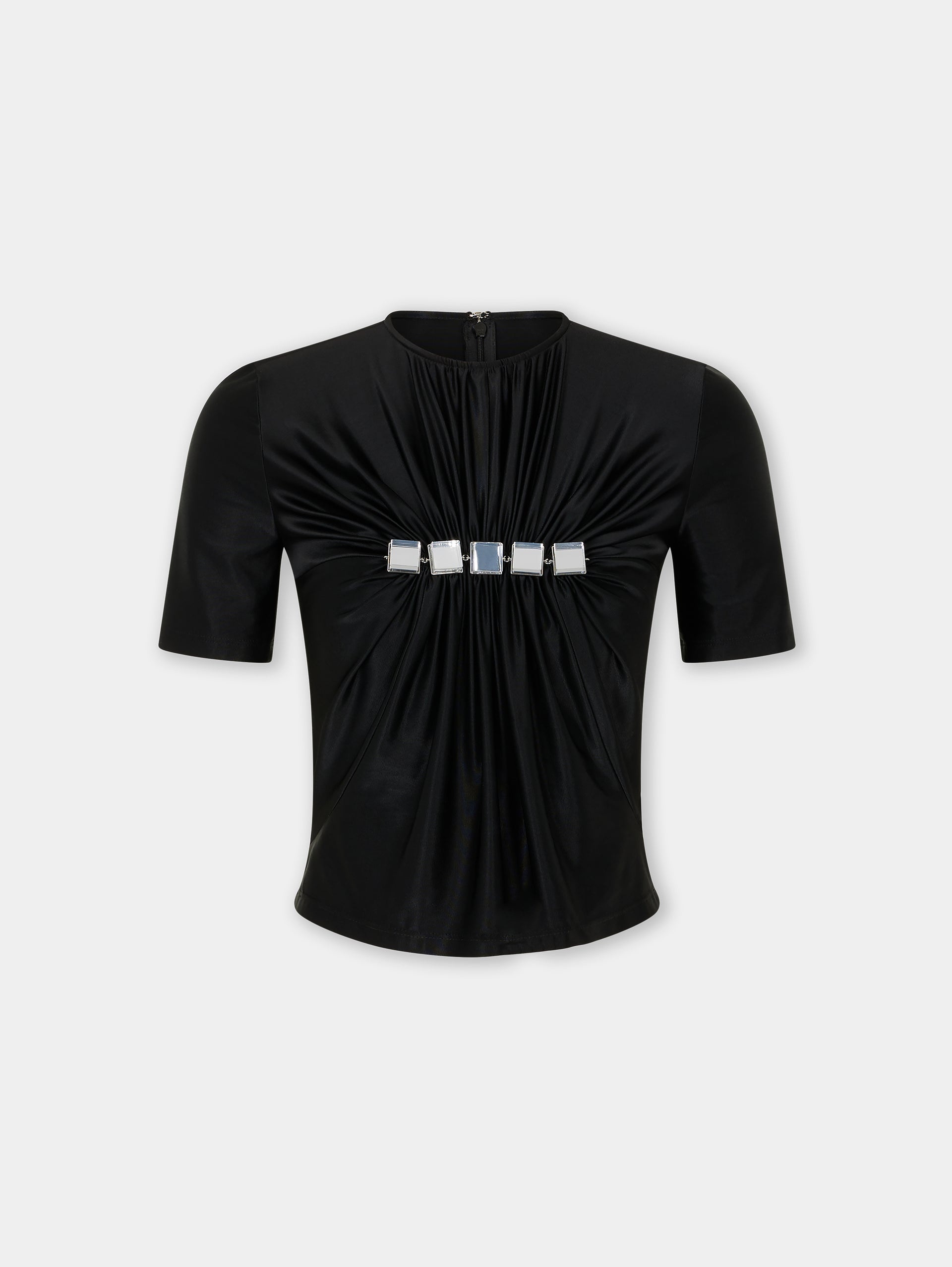 BLACK DRAPED TOP WITH MIRROR-EFFECT EMBELLISHMENTS