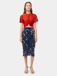 Long skirt with sparkle assembly, handmade in 96 hours of work composed of large sequins inspired by the flamenco print with dark blue and orange pop colors. Embodying the bold aesthetics of Rabanne, it features bright metallic reflections in an elegant yet provocative design. DETAILS - 100% Plastic - Model's height: 178 cm / 5ft 10in. - Model wears a size FR 36 / UK 8 / US 4