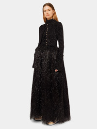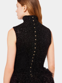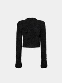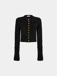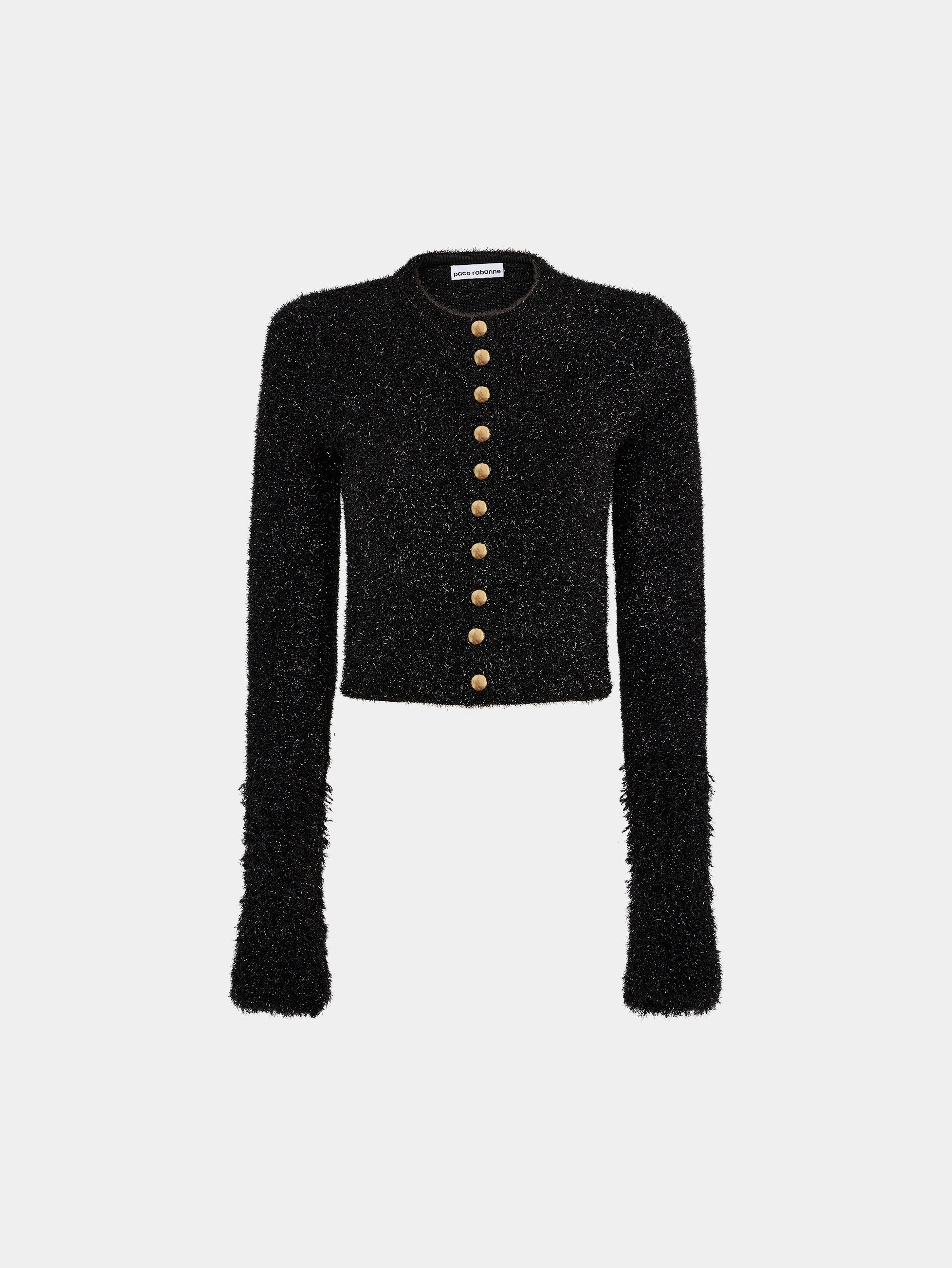 This cardigan features a cropped design and sophisticated Rabanne gold buttons. Reinterpreted in a contemporary way, the knitwear has new short and curved silhouettes. DETAILS Model's height: 178 cm / 5ft 10in. Model wears a size FR 36 / UK 8 / US 4 29% Polyamide, 71% metallized polyester