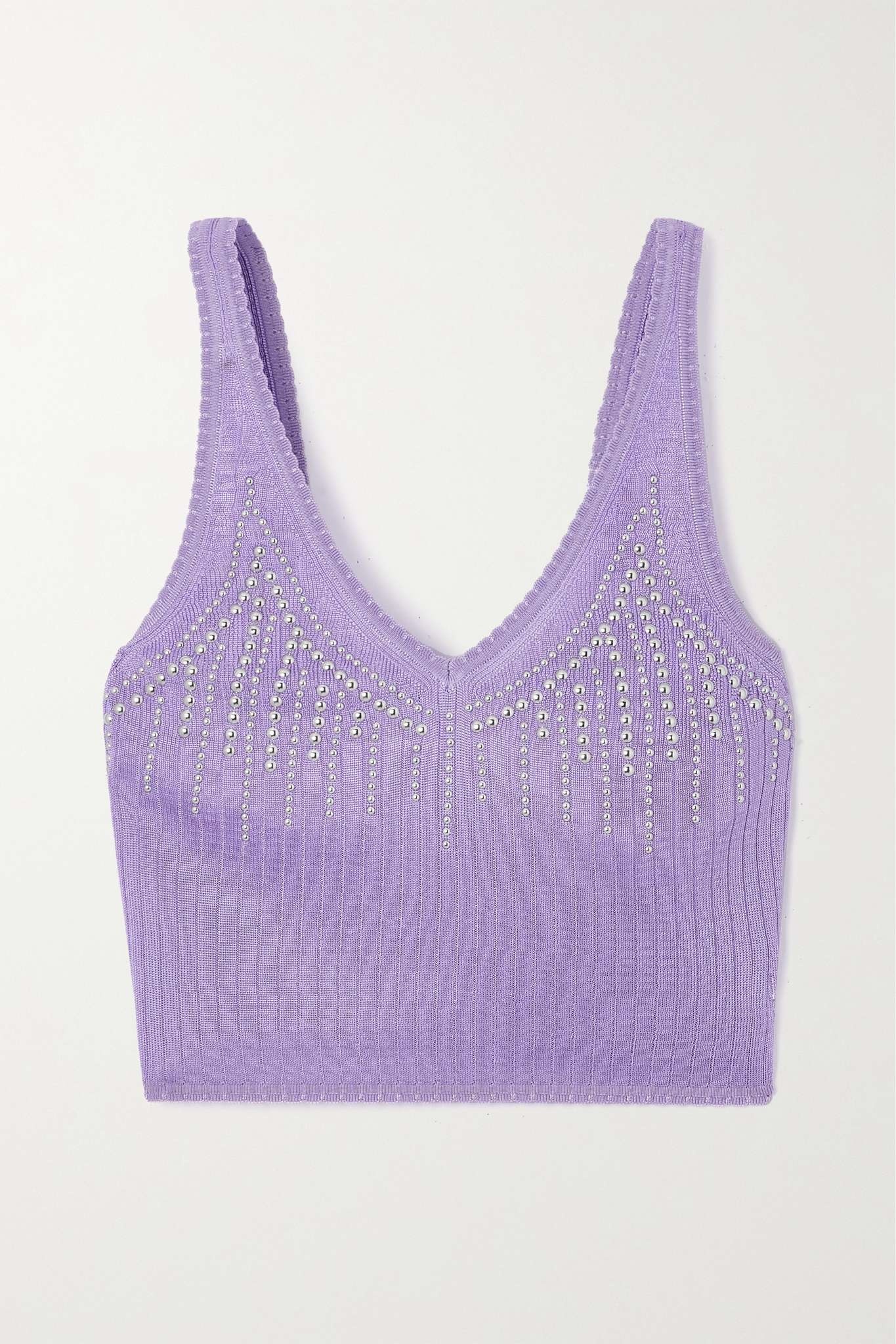 EDITORS'NOTES Paco Rabanne's cropped top feels very Y2K. Made in Italy, it's woven from springy ribbed-knit in a soft lilac hue and embellished with silver studs. Wear yours with low-rise jeans and heels. SIZE & FIT - Fits true to size, take your normal size - Intended for a slim fit - Cropped length - Fine knit - Model is 177cm/ 5'10" and is wearing a size Small DETAILS & CARE - Lilac ribbed-knit - Slips on - 100% viscose - Machine wash or dry clean