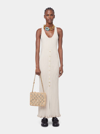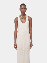 - Color: Ecru - Stretch fabric - Rounded neckline - Sleeveless - Ankle length - Detail of a false opening with 8 signature buttons creating a front slit DETAILS - Composition : 70% Polyester, 30% Viscose - Made in Romania - This style is true-to-size - We recommend your usual size