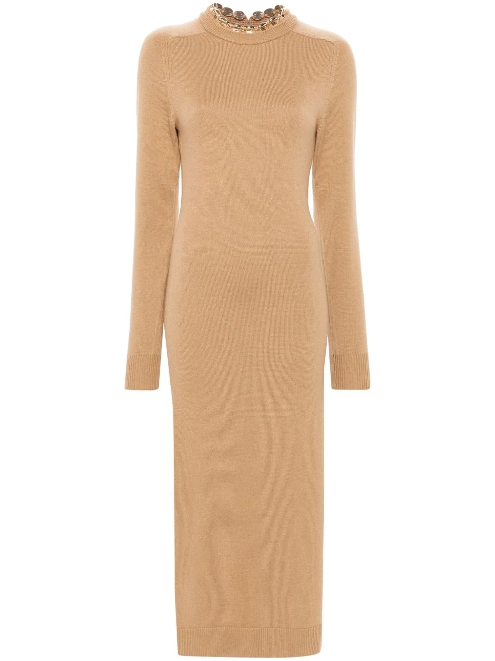 chain-embellished dress Highlights - Camel brown - Merino wool-cashmere blend - Knitted construction - Chain-link detailing - Round neck - Long sleeves - Ribbed cuffs and hem - Below-knee length - Straight hem Made in France Composition Merino 70%, Cashmere 30% SIZE & FIT Model measurements Height 5 ft 10 in(1.78 m) Bust/Chest 31.49 in(80 cm) Hips 37 in(94 cm) Waist 23.62 in(60 cm) FittingInformation Designed for a close fit throughout Made with a midweight knit, this piece offers some stretch This piece fits true to size – take your usual size