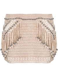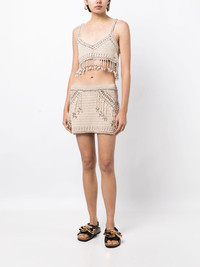 embellished fringed crochet miniskirt Paco Rabanne's miniskirt is crocheted from cotton with open-work detailing at the hem, reflecting the brand’s artisanal aesthetic. It’s finished with fringed trims and silver-tone bead embellishments. Highlights - Beige - Cotton - Crochet knit - Fringe detailing - Bead detailing - Silver-tone hardware - Straight hem Imported Composition Cotton 100% SIZE & FIT Model measurements Height 5 ft 10 in(1.77 m) Bust/Chest 31.49 in(80 cm) Hips 35.43 in(90 cm) Waist 25.19 in(64 cm) FittingInformation This mini-length skirt is intended to be worn low on the hips Made with a midweight knit, this piece offers some stretch This piece fits true to size – take your usual size