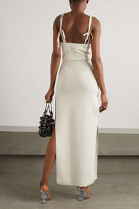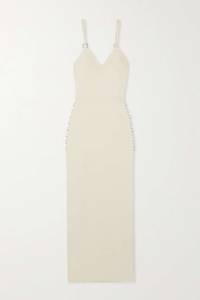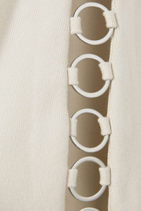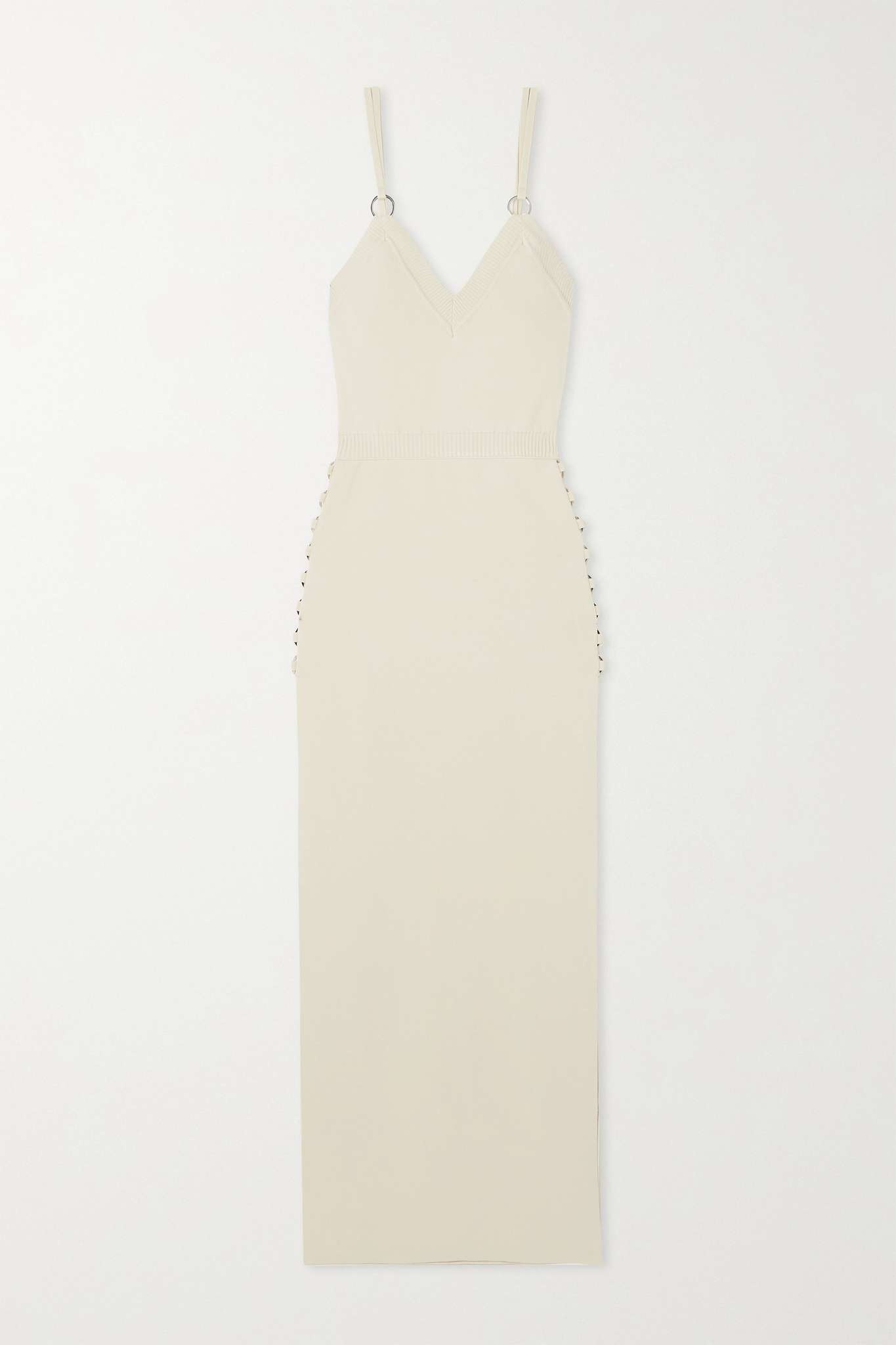 EDITORS'NOTES Silver hardware is part of the brand's DNA but each season, Paco Rabanne finds a new way of incorporating the signature details. This figure-skimming knitted dress is spliced to the thigh on both sides with shiny rings. Fasten the straps into pretty bows at the back. SIZE & FIT - Fits true to size, take your normal size - Designed for a slim fit - Partially adjustable shoulder straps - Mid-weight knit - Model is 177cm/ 5'10" and is wearing a size XSmall DETAILS & CARE - Beige viscose and polyester-blend - Slips on - 70% viscose, 30% polyester - Dry clean