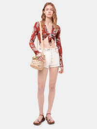 - Color: Off White - Visible buttoning with gold signature buttons - Fringed hems DETAILS Model's height: 176 cm / 5ft 9,5in Model wears a size FR 26 / UK 8 / US 4 - Composition: 100% denim - Made in Italy