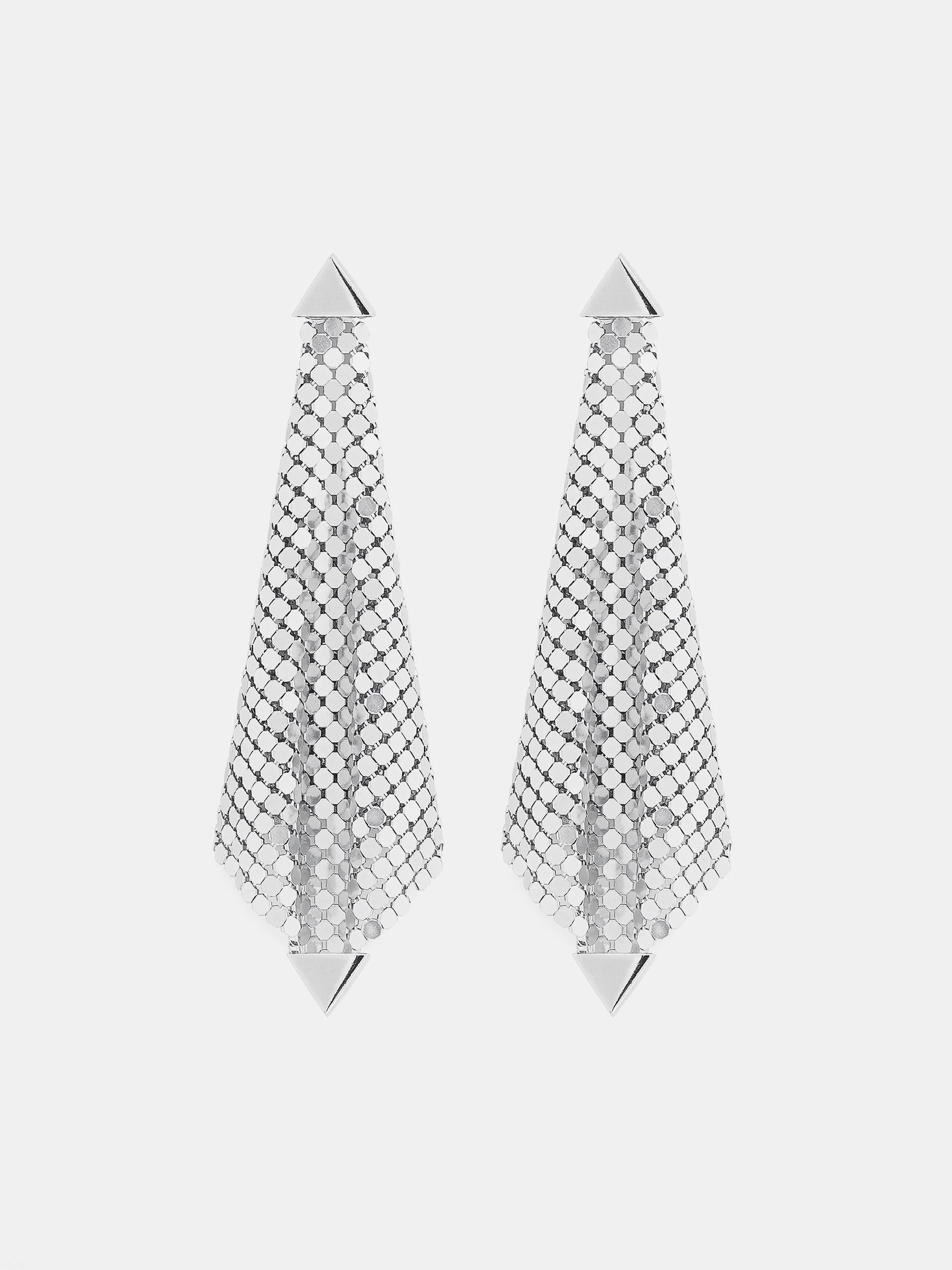 The square earrings design is faithful to the craftsmanship and iconic materials of the Maison Rabanne. Earrings are made from silver mesh forming a diamond shape that falls into an elegant drape. Drop earrings in a soft, flexible and light material, a nod to the DNA of our Maison. DETAILS - Composition : 100% Aluminum - Sold by pair