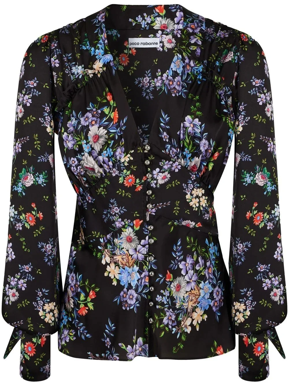 floral-print silk shirt black/multicolour silk all-over floral print ruffled trim panelled bodice V-neck front button fastening long puff sleeves buttoned cuffs straight hem Made in Italy Composition Silk 100%