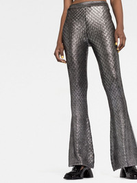 high waist flared trousers Paco Rabanne's affinity for high-octane detailing is captured in the metallic construction of these high-waisted trousers. Detailed with all-over geometric patterning, they're characterised by a flared silhouette that nods to retro styles. Imported Composition Acetate 93%, Polyamide 6%, Elastane 1% SIZE & FIT Model measurements Height 5 ft 11 in(1.8 m) Bust/Chest 31.49 in(80 cm) Hips 36.61 in(93 cm) Waist 24.4 in(62 cm) FittingInformation This piece fits true to size. We recommend you get your regular size Designed to be fitted at the waist and through the thigh, loose from the knee Made with a mid-weight stretch fabric Measurement FRONT RISE 9.48 in(24.1 cm) INSIDE LEG 30 in(76.2 cm) BACK RISE 10.51 in(26.7 cm) HIPS 25 in(63.5 cm) Hem Width 19.01 in(48.3 cm) WAIST 22 in(55.9 cm) Washing instructions Hand Wash