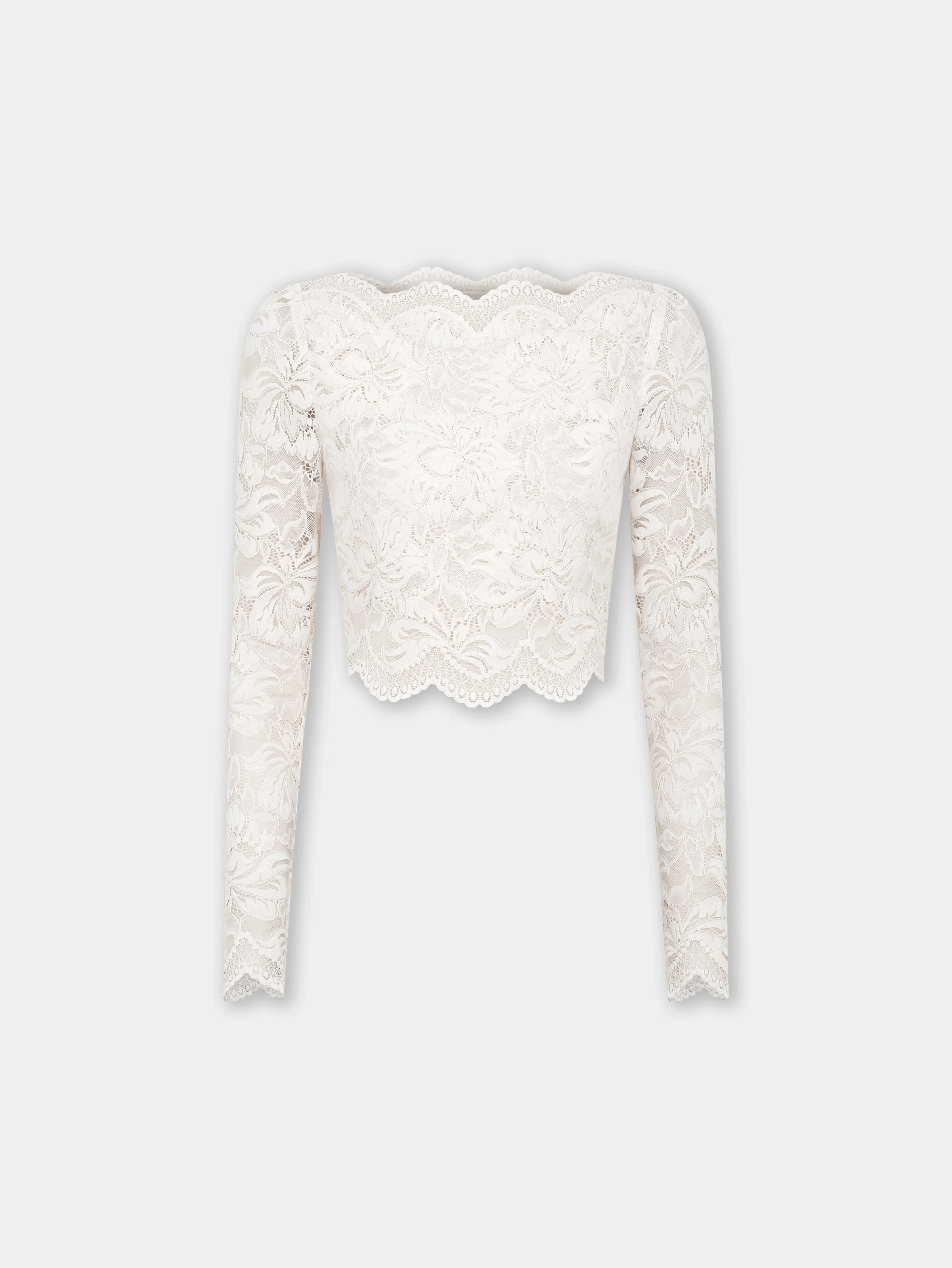 Fitted long sleeve crop top in lace. - Color : Ivory - Double lace lining - Soft, stretchy material - Boat neck - Long sleeves - Scalopped edge - Composition : 90% Polyamide, 10% Elastane - Made in Tunisia Size & Fit - Model's height: 177 cm / 5ft 9,5in - Model wears a size FR 36 / UK 8 / US 4 - This style is true-to-size - We recommend your usual size