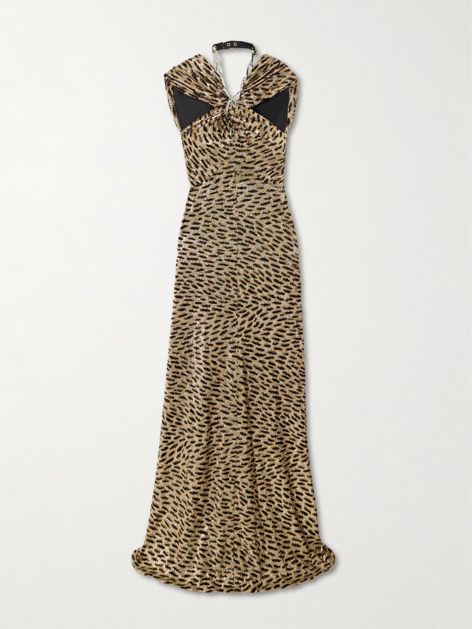 Rabanne’s undeniably glamorous maxi dress is made from leopard-print fil coupe lame with a distinct texture and light-catching finish. It's designed for a slim fit and has a silver-tone chain that loops around the knotted neckline, so you won't require much jewelry. Size & Fit - Fits true to size, take your normal size - Those with a large bust may wish to take the next size up - Designed for a slim fit - Mid-weight, slightly stretchy fabric - Model is 177cm/ 5'10" and is wearing a FR 34 Model measurements: - Bust: 79cm/ 31" - Waist: 61cm/ 24" - Hip: 89cm/ 35" Details & Care - Gold and leopard-print fil coupe lame - Zip fastening along back - 50% viscose, 40% polyamide, 5% polyester, 5% elastane - Dry clean