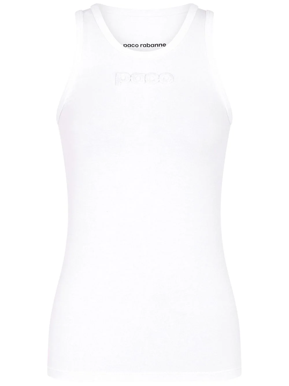 logo-devore cotton tank top Paco Rabanne reimagines the classic cotton tank top with the house’s logo split between the design's front and back, using the devore technique to elevate it from the background. Highlights - White - Cotton - Devore logo to the front and rear - Scoop neck - Sleeveless - Straight hem Imported Composition Cotton 100% SIZE & FIT Measurement LENGTH 24.01 in(61 cm) WAIST 29.01 in(73.7 cm) BUST 30 in(76.2 cm) Washing instructions Machine Wash
