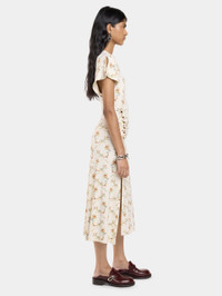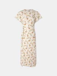 - Color : Bouquet floral print : ecru / red / green - Soft, stretchy material - Crew neck - Short sleeves - Ankle length - 14 silver snap-buttons DETAILS - Composition : 95% Viscose, 5% Elastane - Made in Portugal - Model's height: 177 cm / 5ft 9,5in - Model wears a size FR 36 / UK 8 / US 4 - This style is true-to-size - We recommend your usual size.