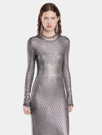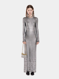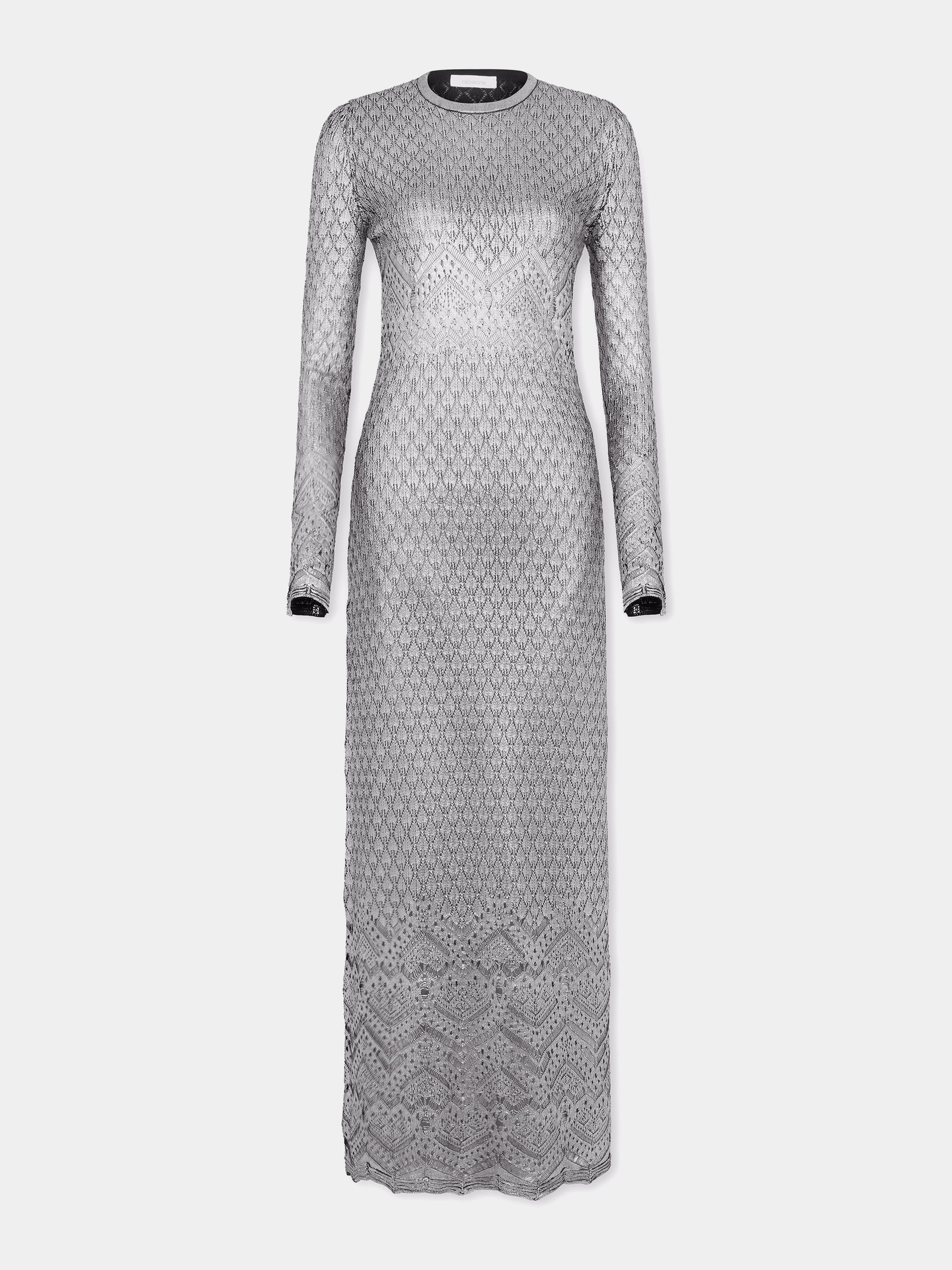 - Color: Silver - Crew neck - Long sleeves - Ankle length - Handmade silver laminated finishing DETAILS - Composition: 100% Viscose - Made in Romania - Model's height: 176 cm / 5ft 9,5in - Model wears a size S - This style is true-to-size - We recommend your usual size
