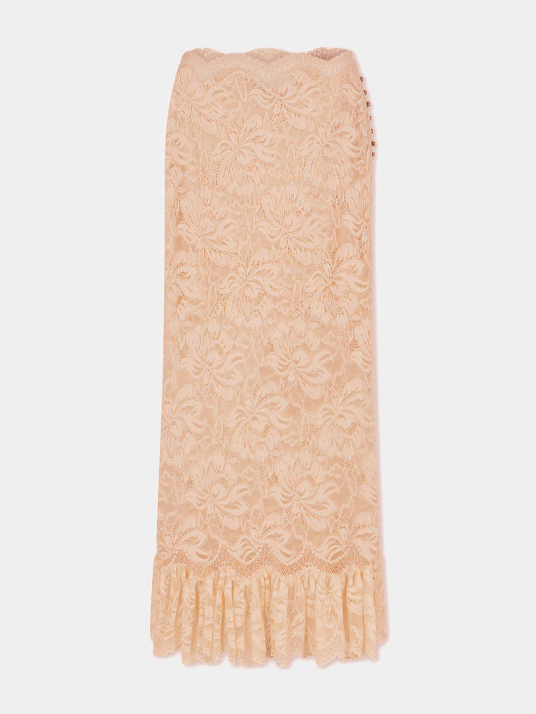 Lace-stretch fabric Lace lining on the skirt - Lace-stretch fabric - Lace lining on the skirt DETAILS Model's height: 176 cm / 5ft 9,5in Model wears a size FR 36 / UK 8 / US 4 - Composition: 90% polyamide, 10% elastane - Made in Tunisia