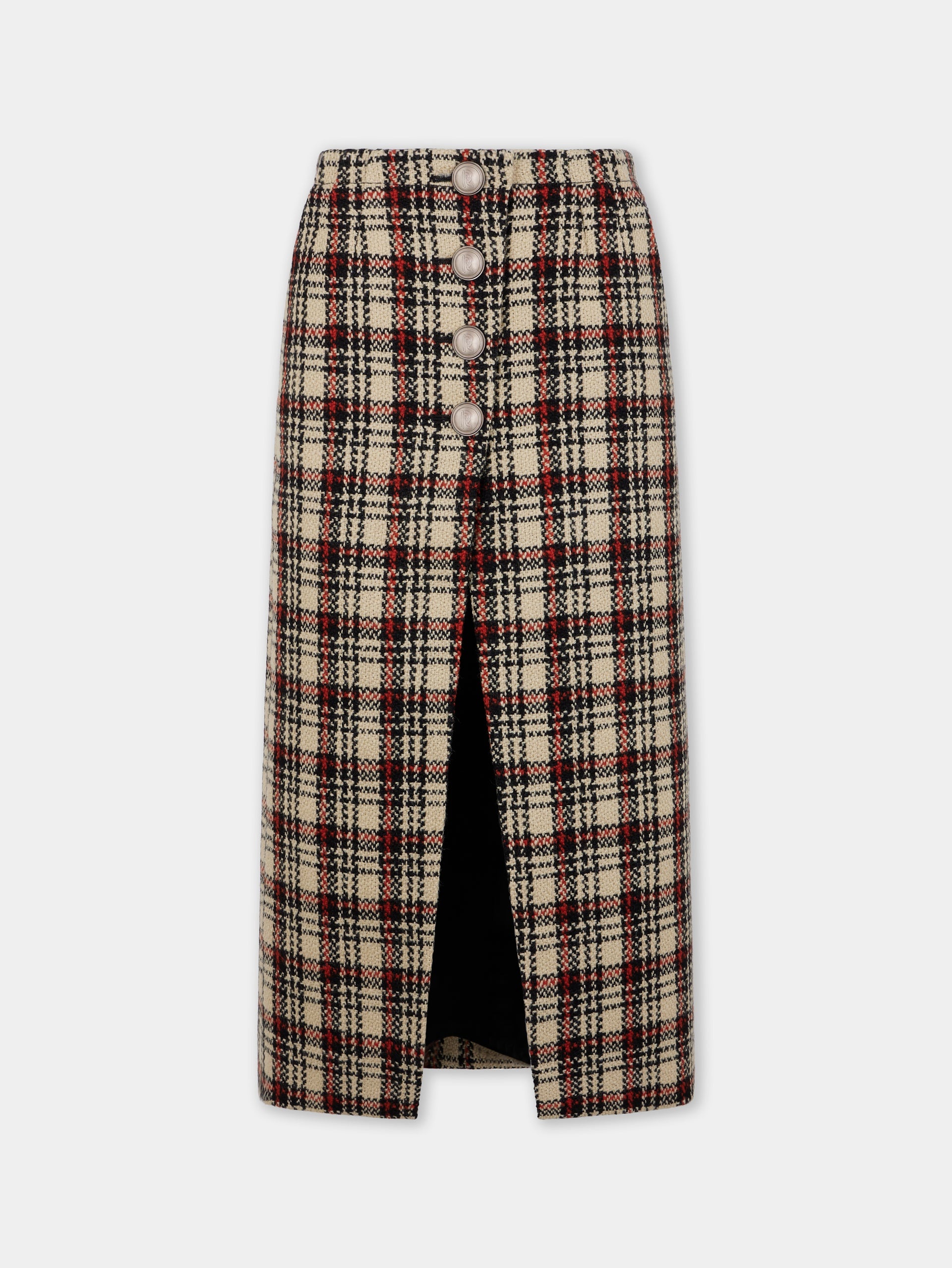 - Color: Tartan : Black/Orange/Cream - Midi length - 4 "fanfare" buttons at the front of the garment DETAILS - Composition: 80% Wool, 20% Cotton - Made in Morocco - Model's height: 171 cm / 5ft 7,5in - Model wears a size FR 36 / UK 8 / US 4 - This style is true-to-size - We recommend your usual size