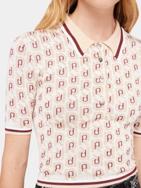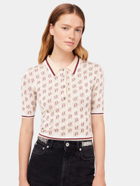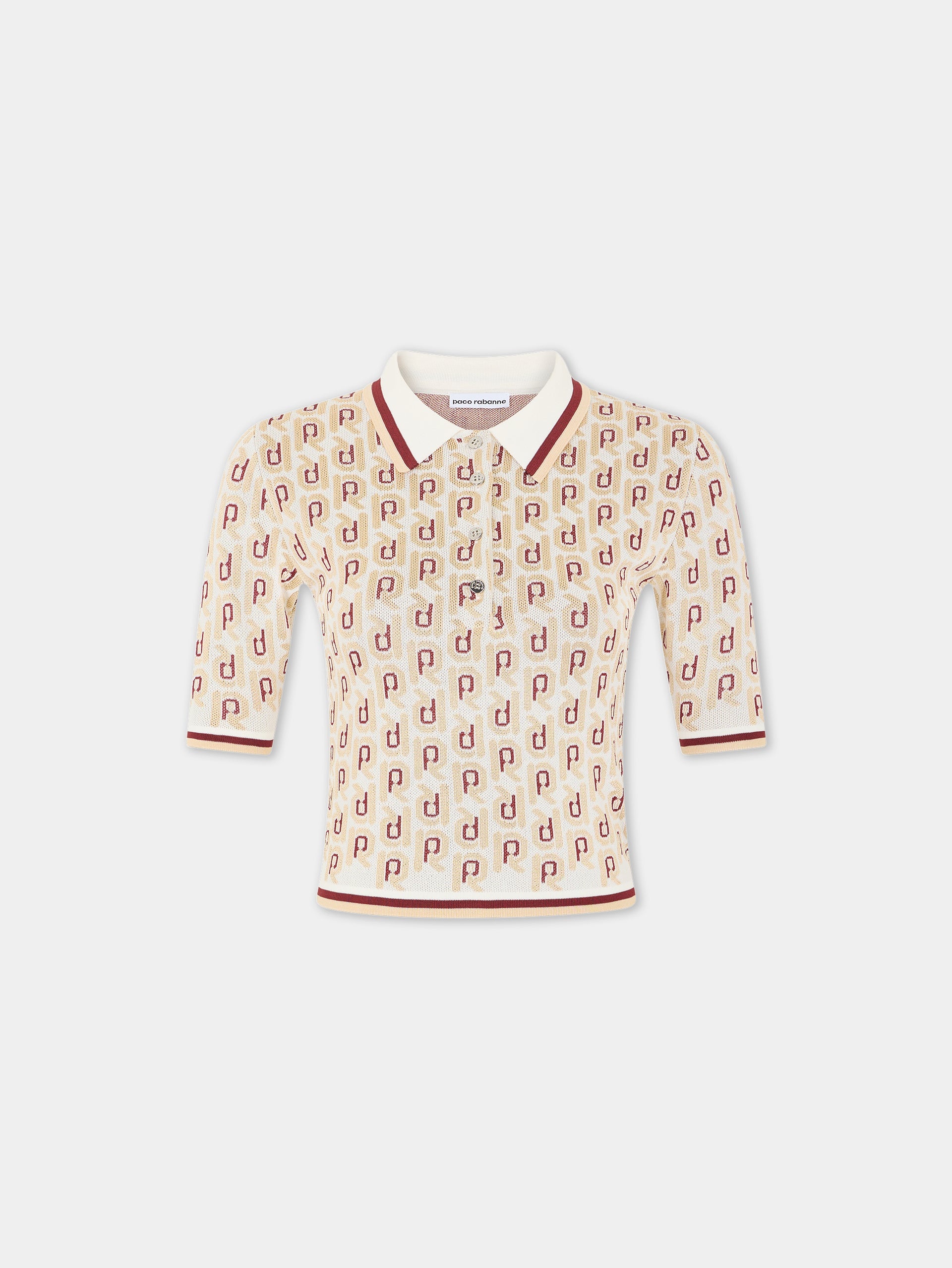 Colour : Jacquard burgundy and silver Short-sleeved polo Adorned with Rabanne logo Silver buttons White club collar - Colour : Jacquard burgundy and silver - Short-sleeved polo - Adorned with Rabanne logo - Silver buttons - White club collar DETAILS Composition: 100% Viscose Model's height: 178 cm / 5ft 10in Model wears a size S