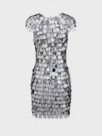 Short-sleeved silver dress assembled with metallic sparkle discs and rings, an iconic design from Maison Rabanne, that gives a mirror effect, reflects the light and shimmers with movement. DETAILS - Washing instructions : Professional cleaning only - Composition : 60% Plastic, 40% Copper