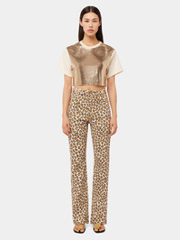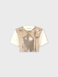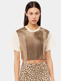 Mix-mesh nude t-shirt made of jersey and rustic cotton. Flounce at the bottom of the garment , t-shirt collar with a gathered braid applied to the material. The front of the tee-shirt is made of light gold mesh and would look great with flare jeans or a dressy skirt.
