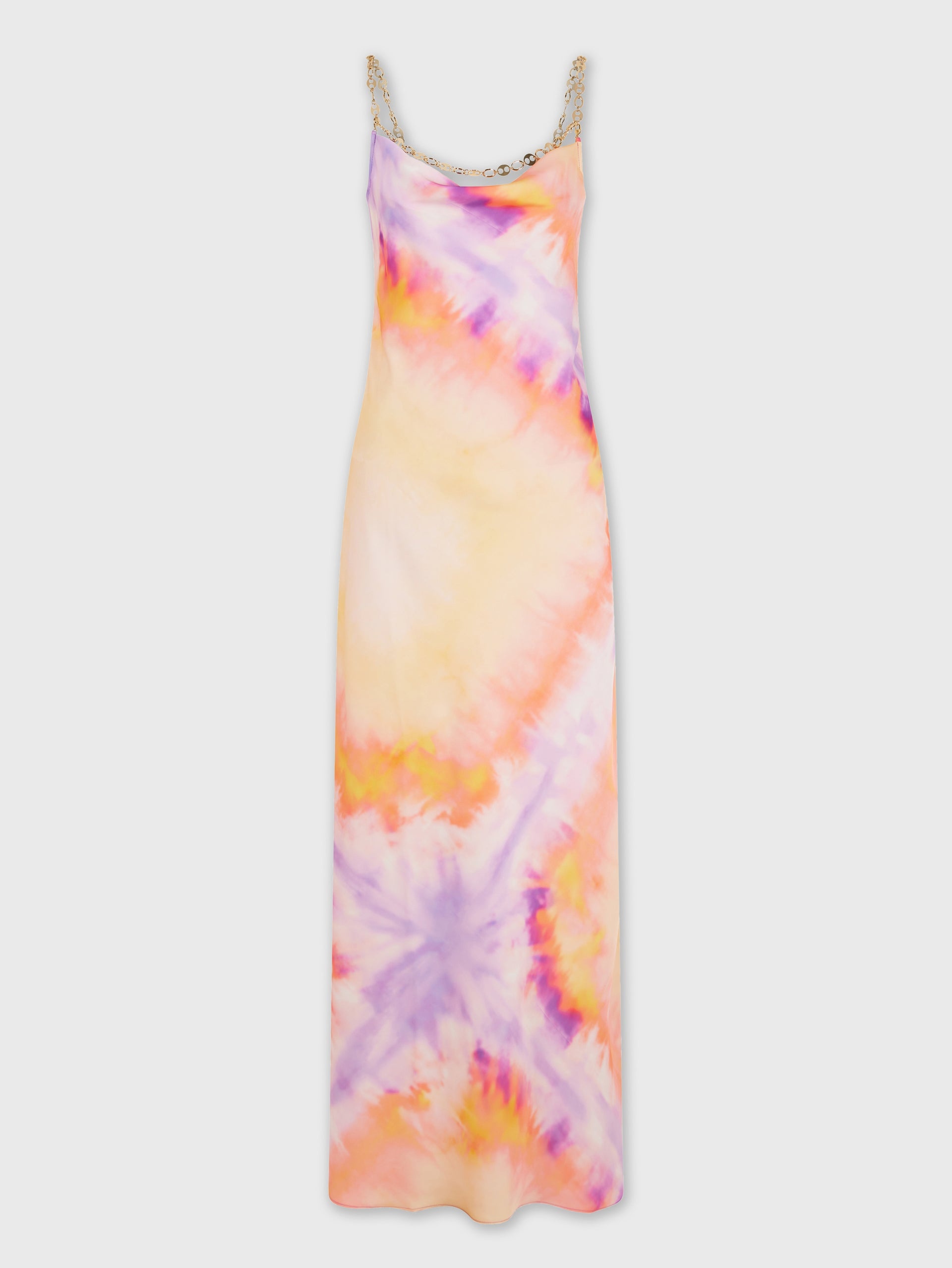 - Color : Orange Tie-dye - Cowl Neck - Sleeveless - Ankle-length - Signature gold chain detail at neckline DETAILS - Composition : 100% Polyester - Made in Tunisia - Model's height: 180 cm / 5ft 11in - Model wears a size FR 36 / UK 8 / US 4 - This style is true-to-size - We recommend your usual size.