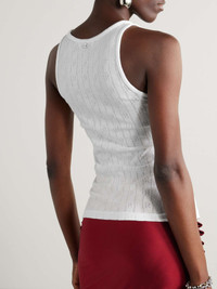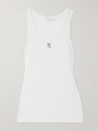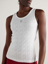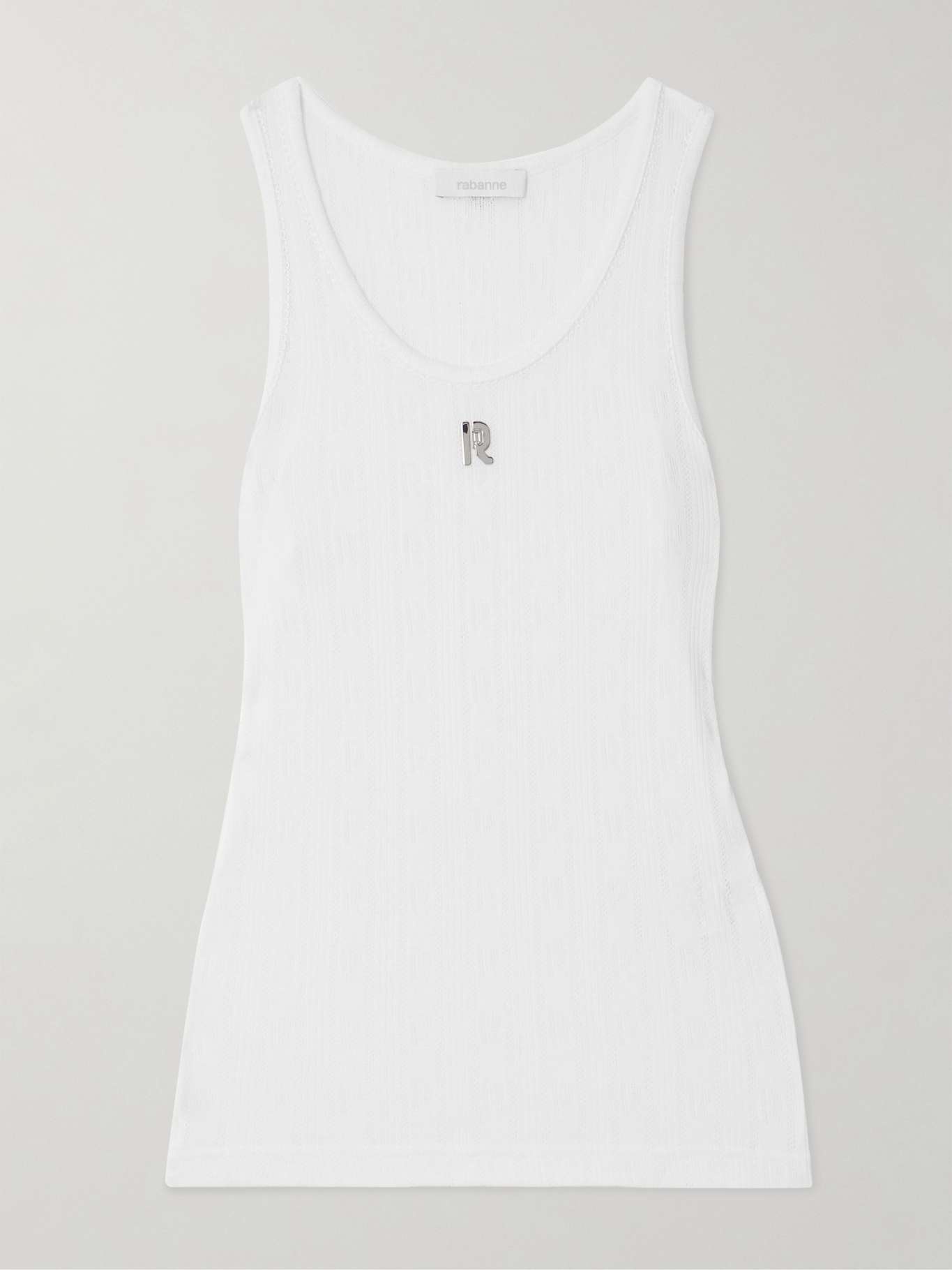 EDITORS'NOTES Rabanne's tank is pointelle-knitted to depict the recurring 'R' logo within the subtle stripes. It's made from soft, breathable cotton in a slim fit and features the silver-tone emblem at the neckline. SIZE & FIT Model measurements: - Fits true to size, take your normal size - Designed for a slim fit - Lightweight, slightly stretchy fabric - Model is 177cm/ 5'10" and is wearing a size Small - Bust: 79cm/ 31" - Waist: 61cm/ 24" - Hip: 89cm/ 35" DETAILS & CARE - White cotton - Slips on - 100% cotton - Machine wash