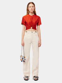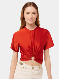 Short Tee-shirt in plain jersey. Design revisited with a short cut, maintained in place by a piercing ring, reinterpretation of an essential for the summer season. DETAILS - 90% Viscose - 10% Elasthanne - Model's height: 178 cm / 5ft 10in. - Model wears size FR 36 / UK 8 / US 4