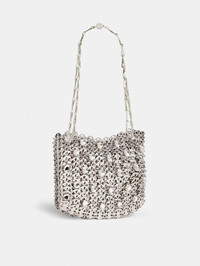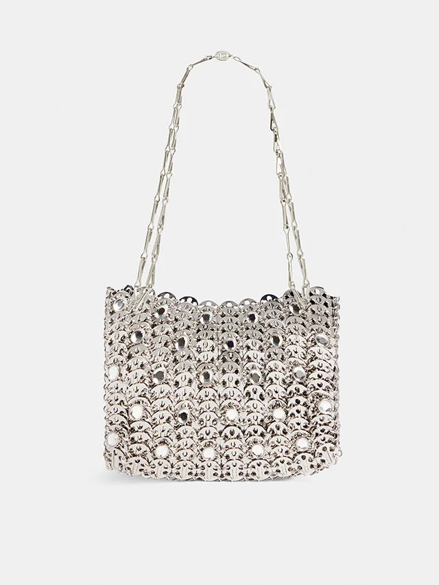 Relaunch of the Iconic 1969 bag with rhinestones. This radiant silver bag adorned with glass rhinestones is a true reflection of the identity and expertise of the Maison Rabanne. The pliable silver bag is a unique fabrication of 367 silver discs bonded by metal rings. DETAILS Carry on the shoulder or by hand - Width 23cm - Length 18.5cm - Depth 2.5cm - Composition : 30% Glass, 70% Bbrass