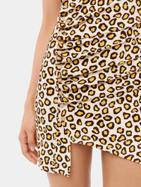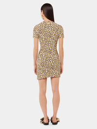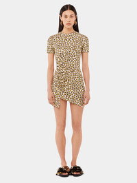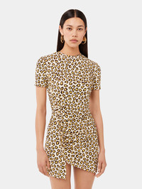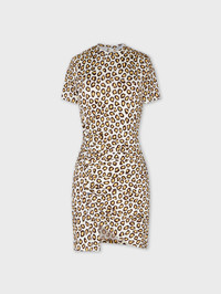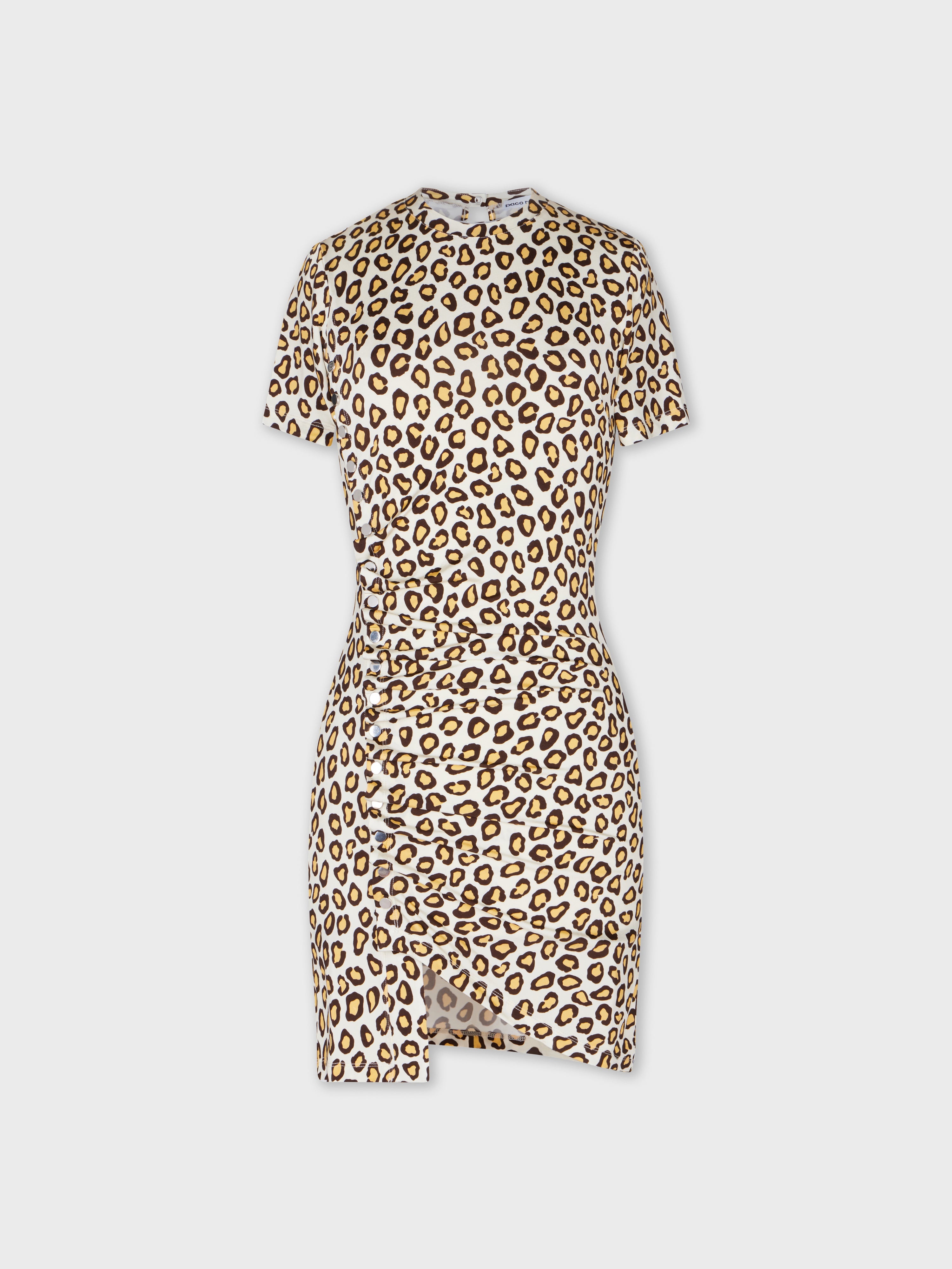 Short-sleeved leopard print jersey dress made in Italy. Draped by pressures on the side of the dress, embellished with a leopard print that infuses energy to the outfit. Displays a linear silhouette with elegant touches. DETAILS - Model's height: 176 cm / 5ft 9 in. - Model wears a size FR 36 / UK 8 / US 4