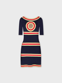 Short dress in lurex. Made up of slits on the sides and a neckline at the back, a play of stripes, and sophisticated details. Paco Rabanne logo in the knitting. The contrasting geometric shape gives it a retro charm.