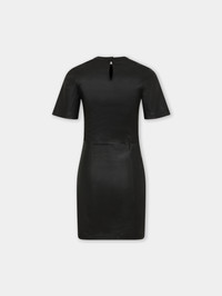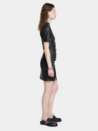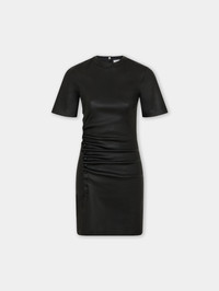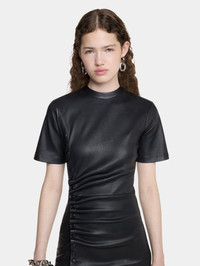 - Color : Black - Soft and stretchy leather - Crew neck - Short sleeves - Short length - 17 leather-covered snap-buttons - Invisible black zip fastening DETAILS - Composition : 100% Lambskin - Made in Turkey - Model's height: 176 cm / 5ft 9,5in - Model wears a size FR 36 / UK 8 / US 4 - This style is true-to-size - We recommend your usual size.