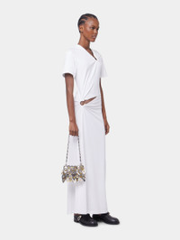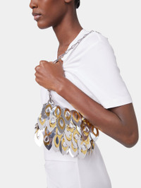 - Colors : Silver / Gold - Silver round discs embellished with silver and gold leave-like sequins and transparent strass. - Offered with a nylon bag. - Multiple wears : handcarry, over the shoulder and crossbody. - Rabanne engraved magnetic closure DETAILS - Composition : 100% Polyester - Made in Madagascar - This style is true-to-size - We recommend your usual size. - 16 x 11 x 4 cm