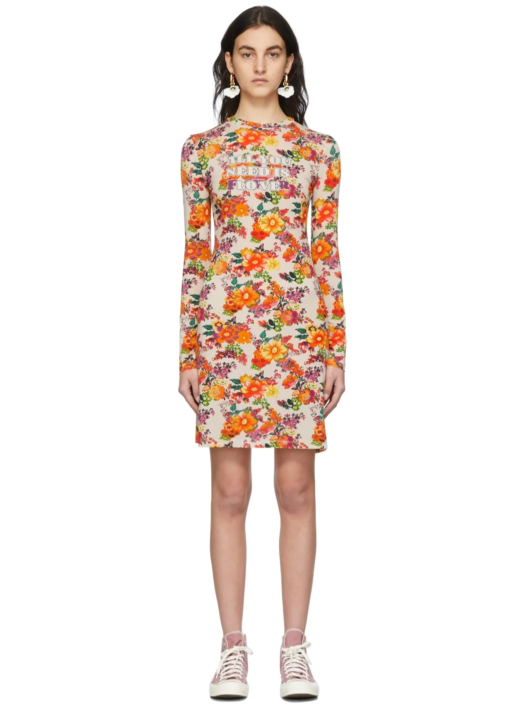 Long sleeve semi-sheer stretch viscose jersey short dress in beige featuring floral pattern printed in multicolor throughout. · Crewneck collar · Logo and text printed in multicolor at chest Available exclusively at SSENSE. Supplier color: Beige/Multicolor