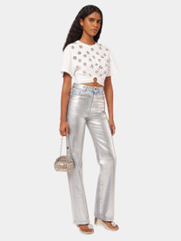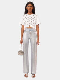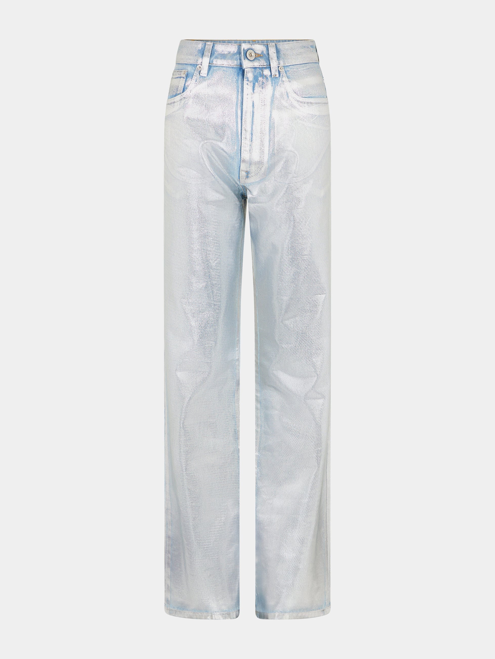 Straight-cut, high-waisted, wide-leg jeans are enhanced by a metallic paint effect that gives a vintage look and echoes Rabanne's iconic fabric. DETAILS Model's height: 178 cm / 5ft 10in. Model wears a size FR 36 / UK 8 / US 4