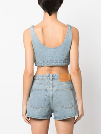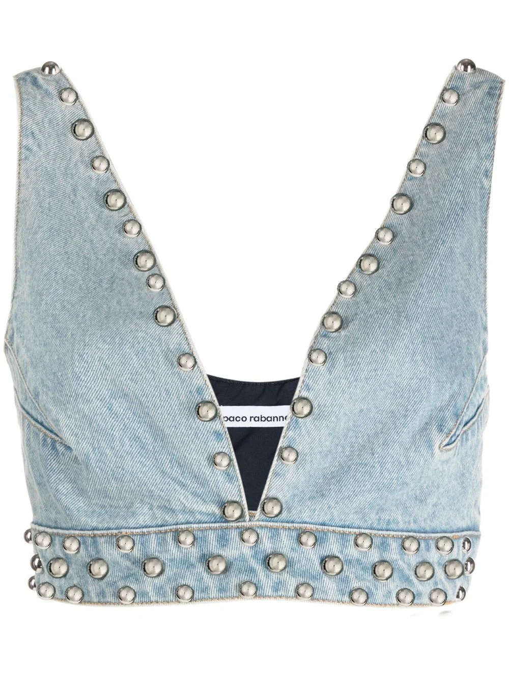 studded denim bralette Paco Rabanne's bralette is traced with silver-tone studs along the V-neck and hem for brand-typical edge. It’s made from denim in a light-blue wash. Highlights - Light blue - Cotton - Washed denim - Silver-tone stud embellishment - Plunging v-neck - Bralette style - Cropped Imported Composition Cotton 100% SIZE & FIT Model measurements Height 5 ft 11 in(1.8 m) Bust/Chest 31.49 in(80 cm) Hips 35.43 in(90 cm) Waist 24.4 in(62 cm) FittingInformation Designed for a slim fit that sits just away from the body offering a close yet comfortable fit Sturdy and hard-wearing, this denim piece offers no stretch This piece fits true to size – take your usual size Washing instructions Machine Wash