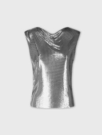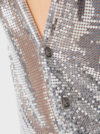 Shiny silver mesh top. This sleeveless silver mesh top combines the simplicity of the cut with the sophistication of an iconic fabric from the Maison Rabanne. This lightweight, soft silver top is very comfortable to wear. - Snap buttons on the side engraved with the Paco Rabanne logo - Washing instructions : Clean it by hand only - Composition : 100% Aluminum Size & Fit - Model's height: 180 cm / 5ft 11in - Model wears a size FR 36 / UK 8 / US 4 - This style is true-to-size - We recommend your usual size.
