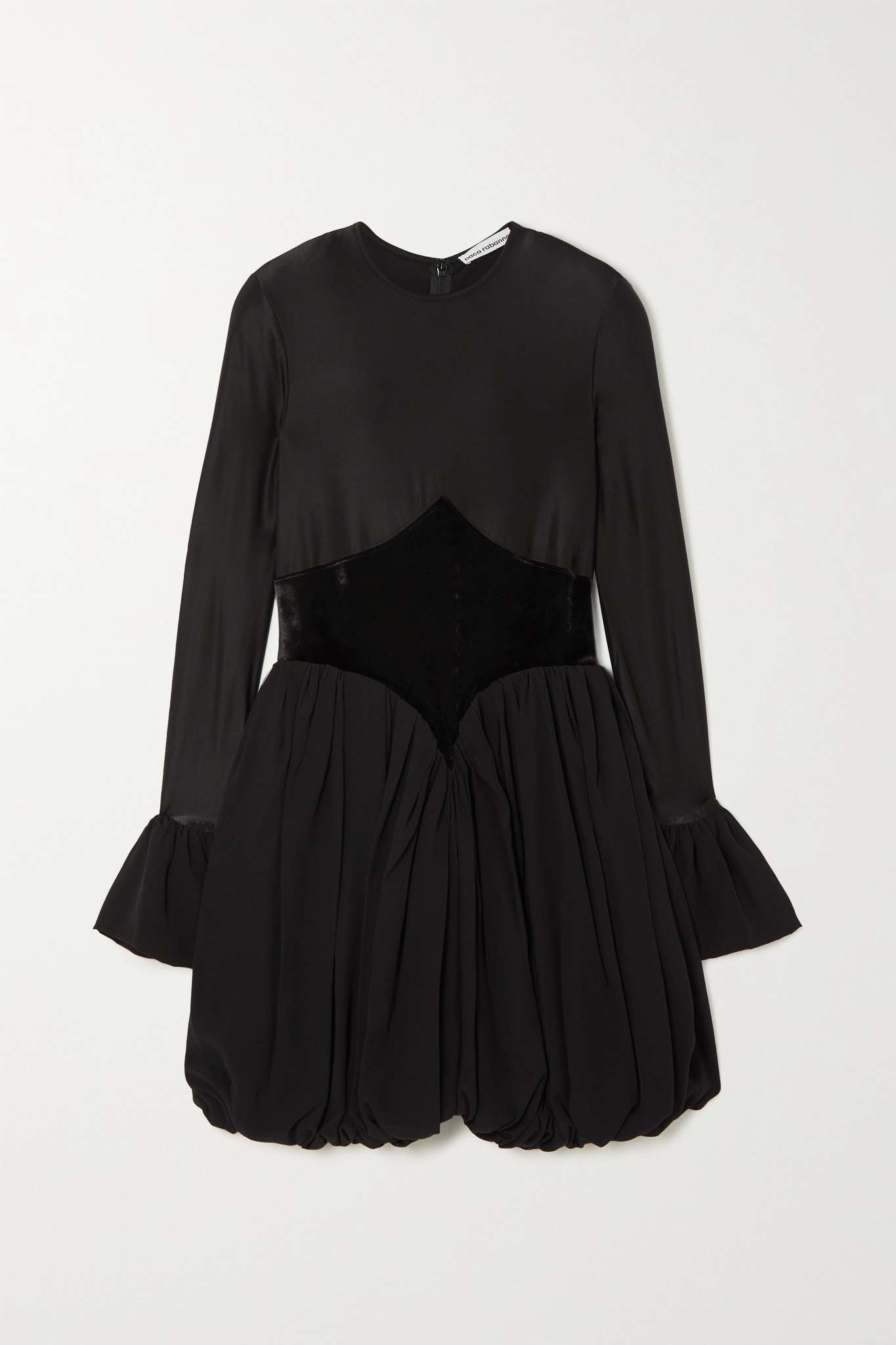 EDITORS'NOTES Paco Rabanne's Creative Director Julien Dossena describes the brand's Fall '22 collection as "an exploration of volume and proportion." A perfect example, this mini dress is cut from crepe de chine with a fitted bodice, flouncy bell cuffs and a gathered puffball skirt. The plush velvet panel at the waist creates a tactile contrast. SIZE & FIT - Fits true to size, take your normal size - Designed to be fitted at the bust and waist, loose at the hip - Internal shoulder pads - Mid-weight, stretchy fabric - Model is 177cm/ 5'10" and is wearing a FR 36 DETAILS & CARE - Black crepe de chine and velvet - Concealed zip fastening along back - 62% acetate, 38% viscose - Dry clean